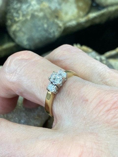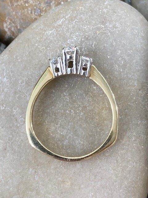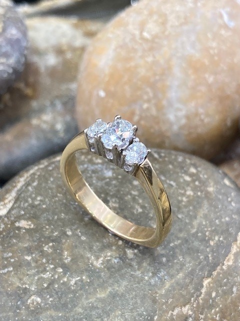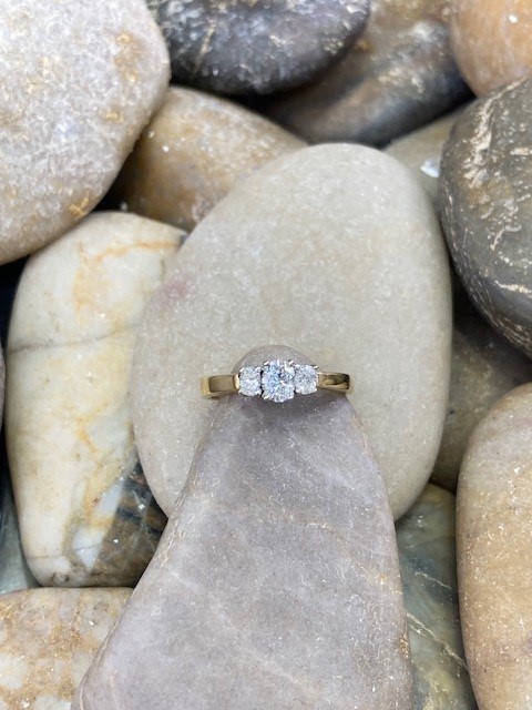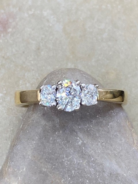 This timeless trinity ring showcases three exquisite oval-cut diamonds, each ethically mined and expertly matched for a harmonious look. Graded SI1 in clarity and displaying a warm I–J colour, the diamonds offer a beautiful balance of brilliance and character, the center diamond weighs 0.44 carat and the side stones total 0.28 carat. They are elegantly set in 18 karat white gold, creating a striking contrast against the rich yellow gold Euro shank. With a total weight of 5.288 grams, this piece blends classic design with refined craftsmanship—perfect for marking life’s most meaningful moments.
