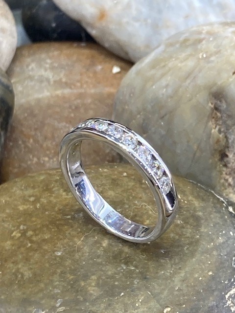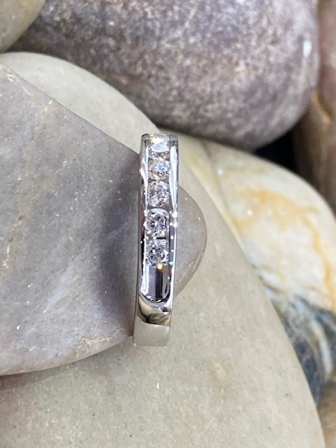 Crafted with timeless elegance, this classic channel-set half eternity ring is made in 14 karat white gold and designed to shine from every angle. The band features 10 round minded diamonds securely set within a sleek channel, creating a smooth, sophisticated look while protecting the stones.