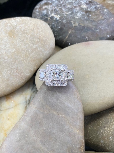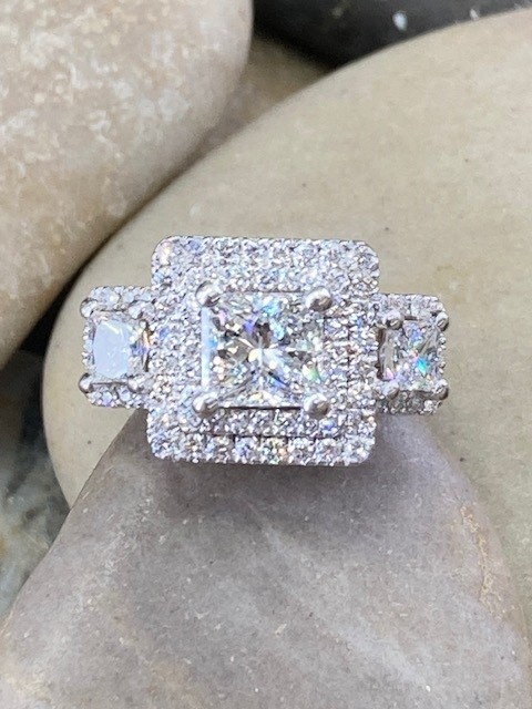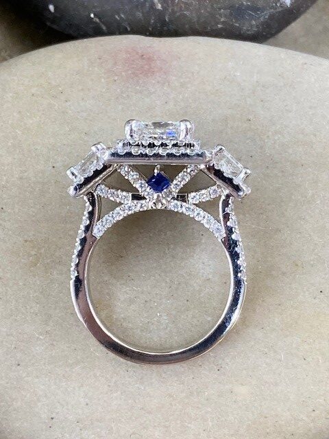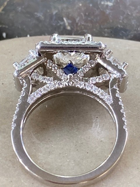 This stunning ring showcases a 0.95 carat princess-cut diamond at its center, framed by a striking double halo. Flanked by two additional princess-cut diamonds totaling 0.46 carat, all three stones are beautifully matched with VS2 clarity and H color. Enhancing the design further, 146 meticulously set accent diamonds adorn the sides and encircle the side stones, totaling 1.07 carats with a clarity range of VS2 to SI2 and colors from G to H. Hidden beneath the center diamond, two small square sapphires add a subtle and unexpected touch of intrigue to this exceptional ring.
