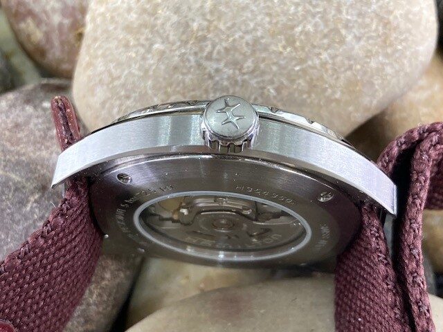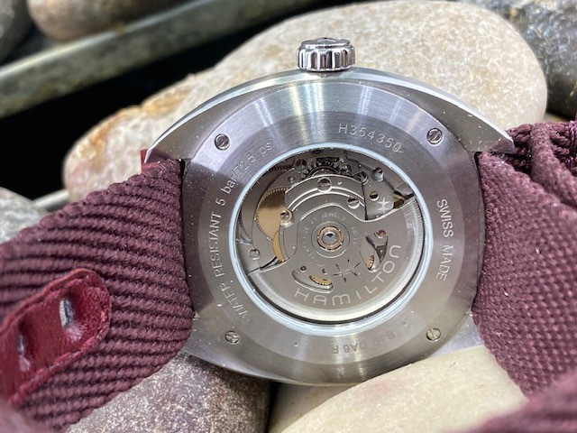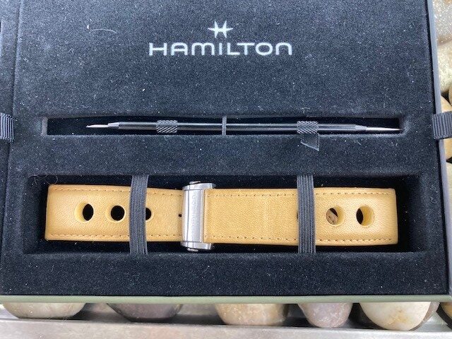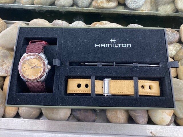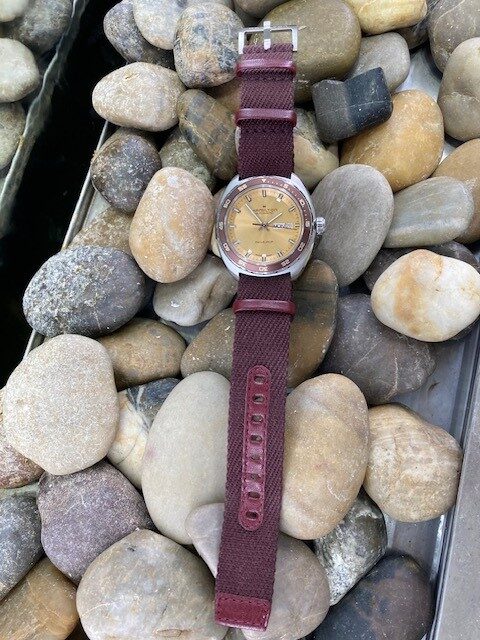 Strap type: yellow cow leather “rally’ & burgundy nylon Nato with leather keepers and hole reinforcement