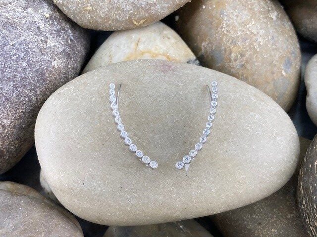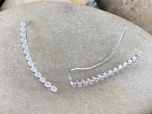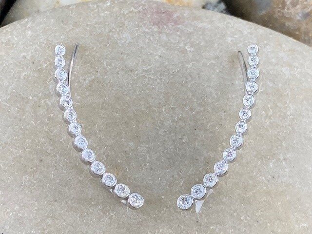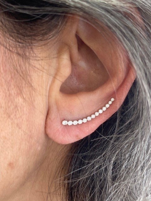 These unusual earrings are designed to sweep gracefully up the ear, creating a striking and elegant silhouette. Crafted in luxurious 18 karat white gold, showcasing 26 carefully selected mined diamonds that shimmer with exceptional brilliance. The artisans of Simon G meticulously matched every stone to achieve VS clarity and a beautiful G–H colour range, with a total carat weight of 0.26, ensuring a refined sparkle from every angle. The result is a distinctive and sophisticated design that elevates any look with modern elegance and timeless craftsmanship.