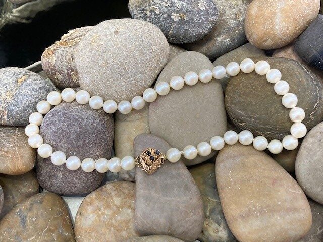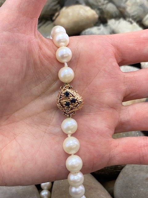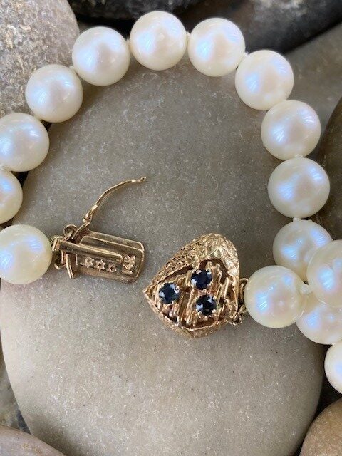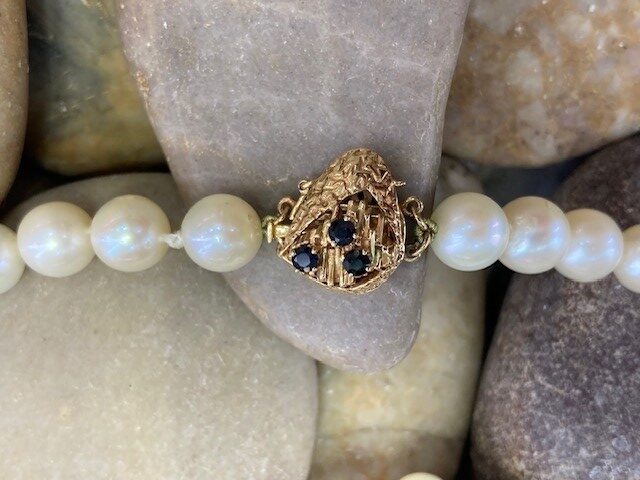 The strand is secured with a distinctive 14 karat yellow gold tongue clasp, thoughtfully designed in a rounded triangular shape. Adorned with three delicate sapphires, the clasp adds a subtle touch of rich color and individuality. A figure-eight safety clasp provides added security, ensuring both beauty and peace of mind when worn.