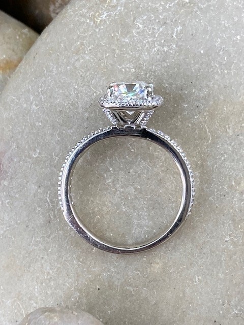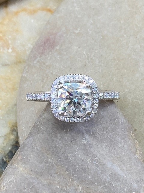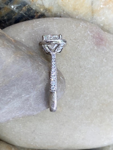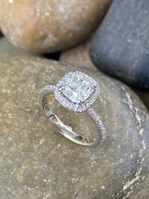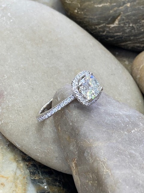 Discover timeless brilliance with this exquisite 1.23 carat Canadian diamond engagement ring. Featuring an ideal cushion cut by Forevermark, the centre diamond is expertly crafted with excellent cut, polish, and symmetry to maximize its fire and sparkle. Graded VVS1 clarity and I colour, it offers exceptional purity and scintillation.