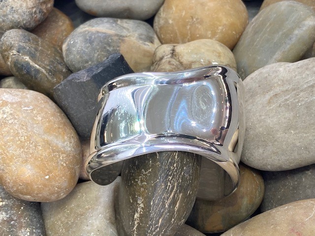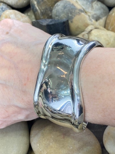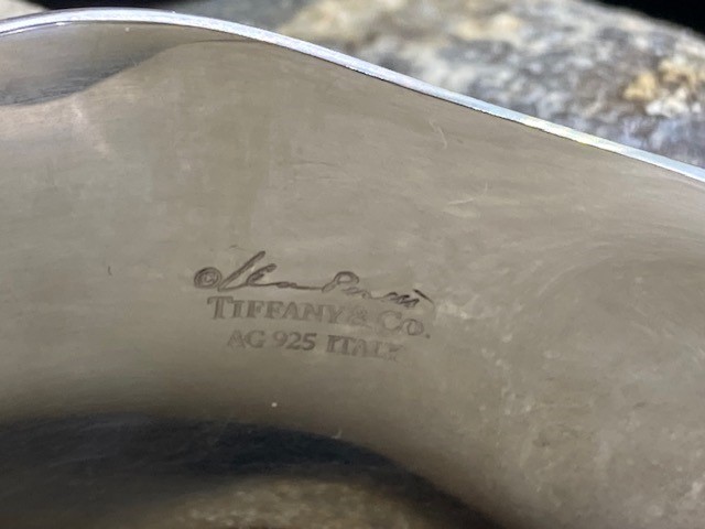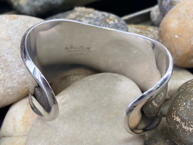 Designed in 1970 by legendary Tiffany designer Elsa Peretti, the handcrafted sterling silver Bone Cuff features a sculptural form that gracefully follows the natural contours of the wrist. This small size measures 43mm in width and is designed to fit closely on a medium wrist. Intended to be worn alone or as a pair, this iconic piece remains highly sought after for its timeless elegance and distinctive design.