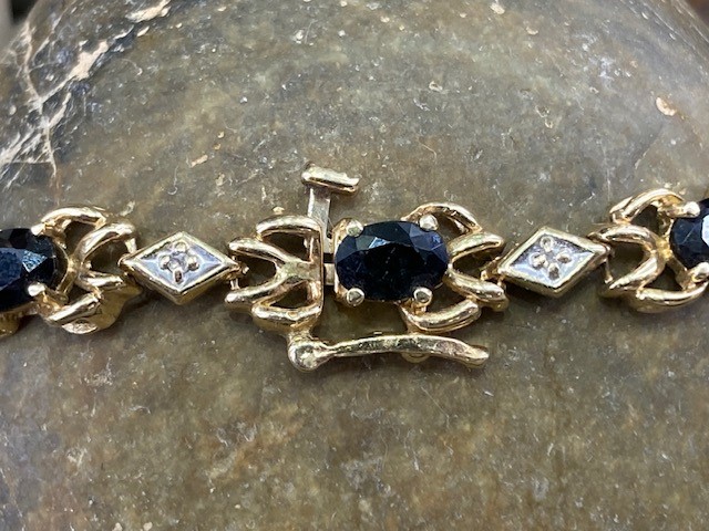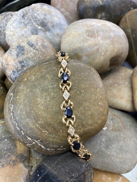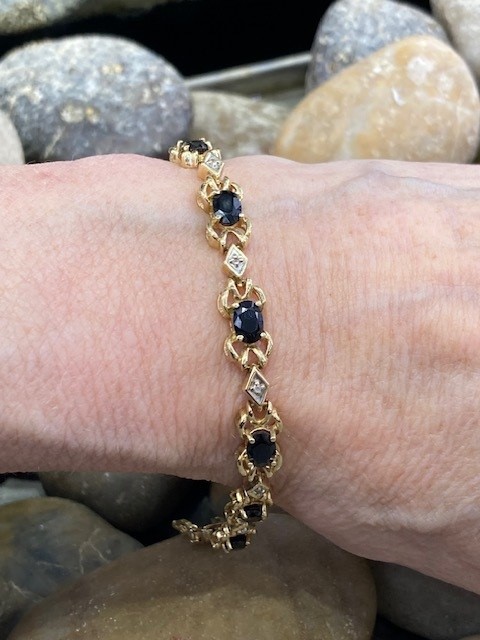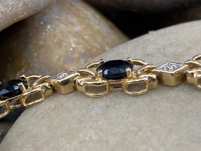 This elegant 14 karat yellow gold bracelet showcases ten dark oval sapphires, each measuring 4 x 6 mm, with a total sapphire weight of 6.38 carats. Between each sapphire link, delicate mined diamond accents add subtle sparkle, totaling 0.06 carat with I2 clarity and I color. Weighing 10.86 grams, the bracelet is secured with a side ways tongue clasp and an added side safety clasp for confident, comfortable wear. A timeless 7″ piece that blends rich color with graceful brilliance, perfect for both special occasions and everyday elegance.