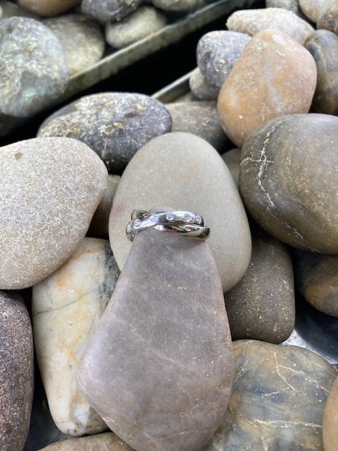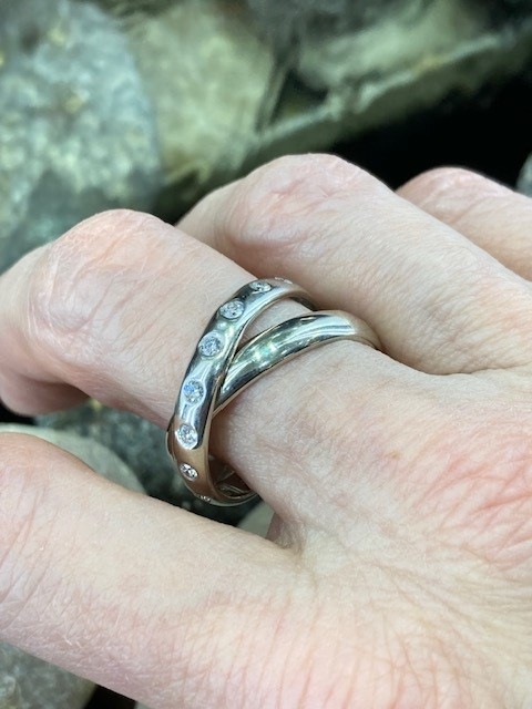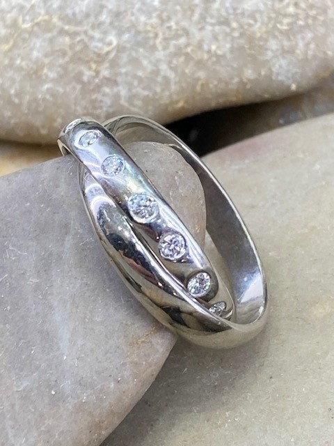 One of the bands features 16 gypsy set diamonds, totaling 0.34 carats. These diamonds have been carefully selected for their VS clarity and G to H colour range, ensuring exceptional brilliance and sparkle. With a total weight of 7.749 grams, this ring offers a substantial and luxurious feel, making it the perfect symbol of commitment and style. This ring is approximately size 9, please contact us if you would like to have it sized.