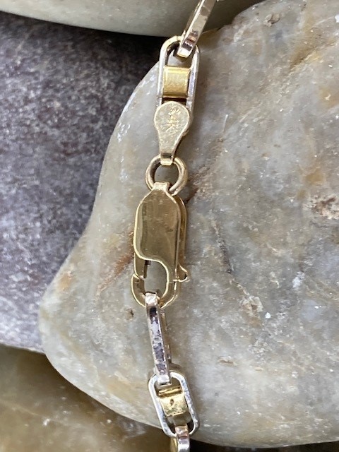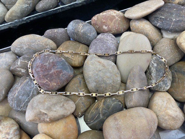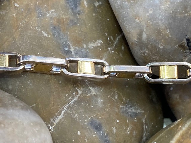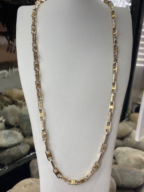 This modern chain offers a refined variation on the classic bar link design. Crafted in 14 karat yellow and white gold, it measures 18.5 inches in length and features a substantial feel with a total weight of 16.24 grams. Bold yet versatile, this heavy chain is a striking choice for both men and women, perfect worn on its own or layered for a contemporary look.