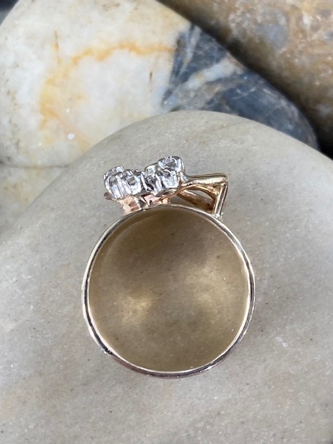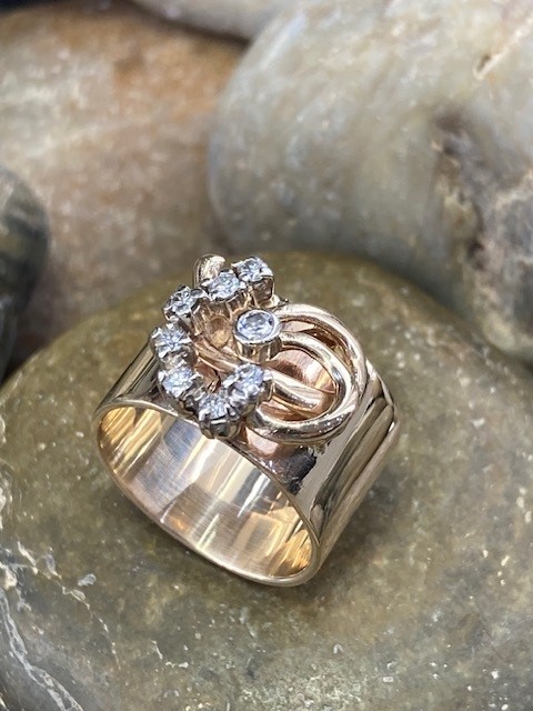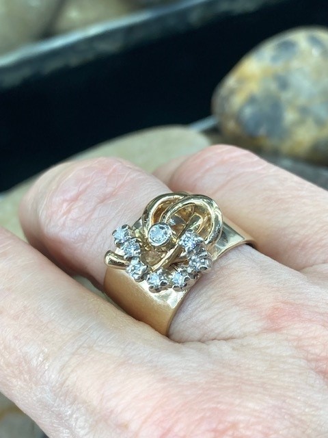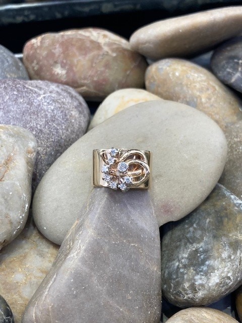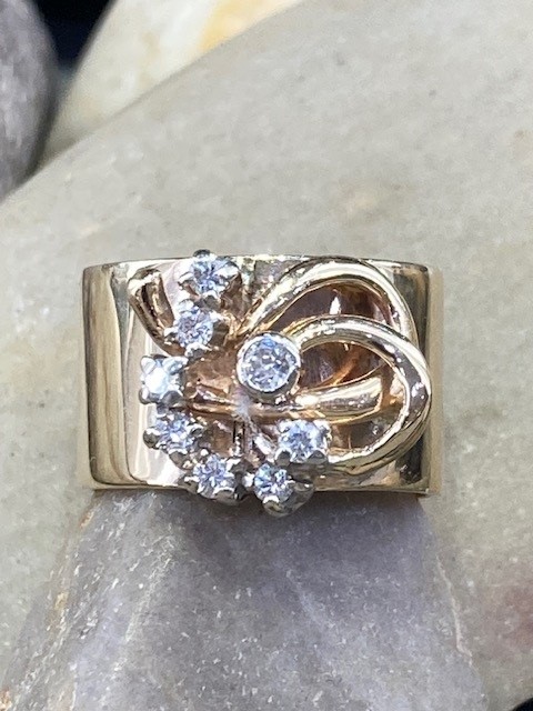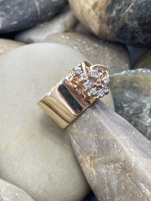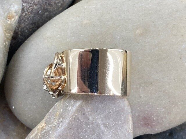 The sculptural bow sits proudly atop a substantial 12 mm wide shank, making it a perfect statement piece for those who love expressive, eye-catching jewellery. Made in 14 karat yellow gold with a total weight of 11.56 grams, the ring has a luxurious, solid feel.