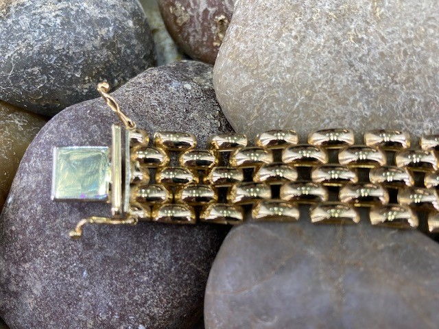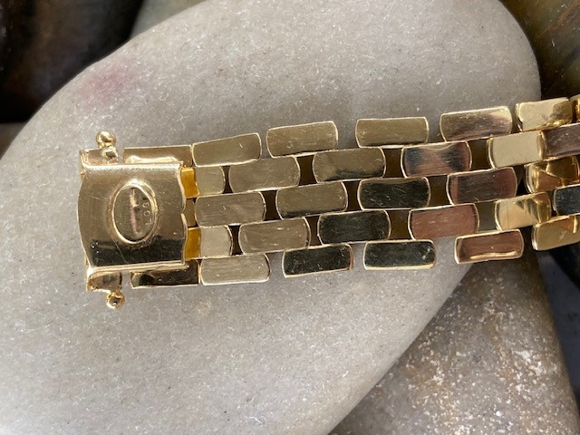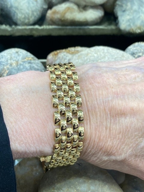 This incredible panther link bracelet measures 7.5 inches in length and 5/8 of an inch in width, offering a bold and luxurious presence on the wrist. Crafted in rich 18 karat yellow gold and weighing an impressive 35.317 grams, this striking piece is designed to make a statement. Timeless in both style and craftsmanship, it is a bracelet meant to be worn, admired, and treasured for years to come.