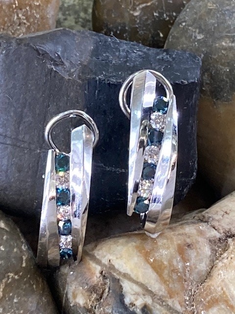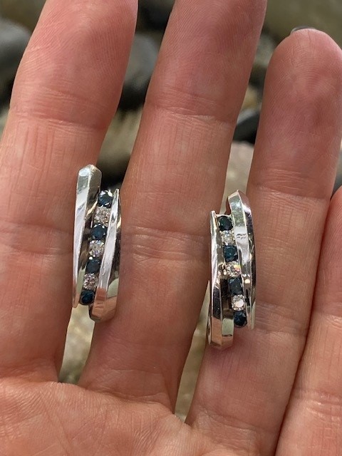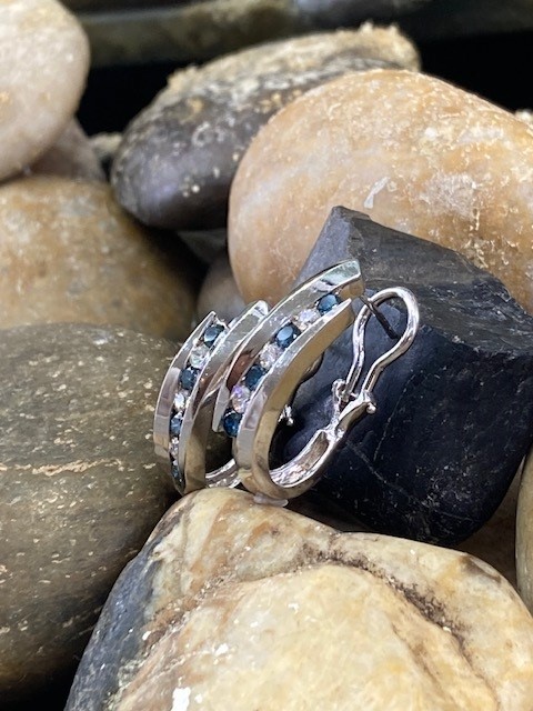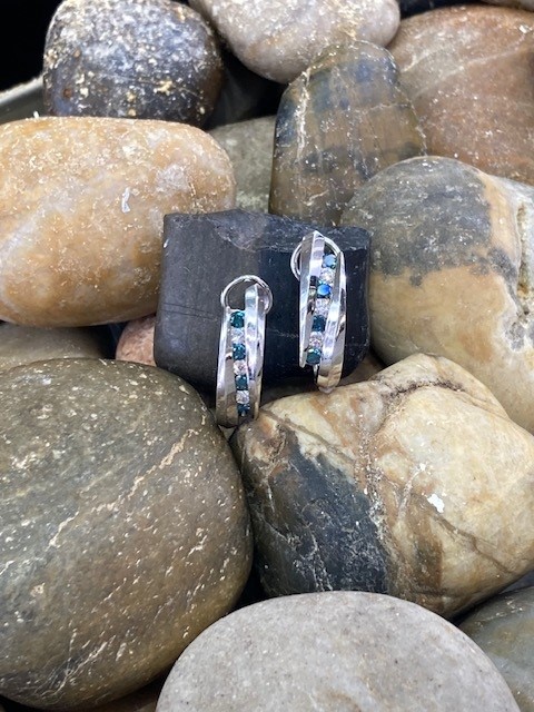 Elegant and eye-catching, these 14 karat white gold earrings are designed to make a refined statement. They feature secure omega backs for a reliable fit, while the sleek channel setting enhances the brilliance of each stone. Showcasing a stunning combination of 8 vivid blue mined, heat treated diamonds and 6 classic white mined diamonds, these earrings have a total diamond weight of 1.00 carat. With a substantial gold weight of 8.791 grams, they offer both luxury and durability—perfect for adding a sophisticated sparkle to any occasion.