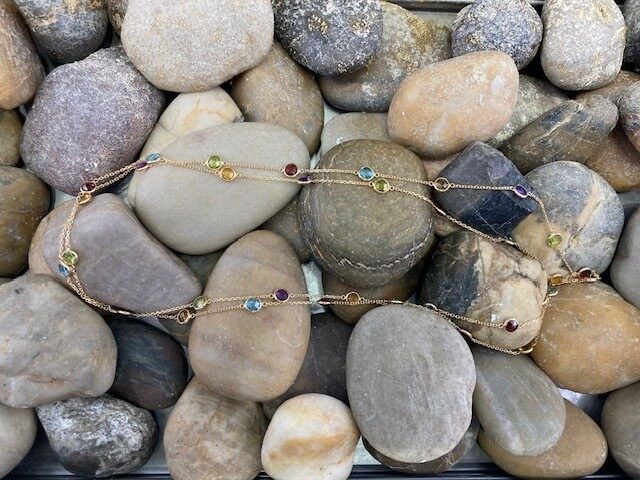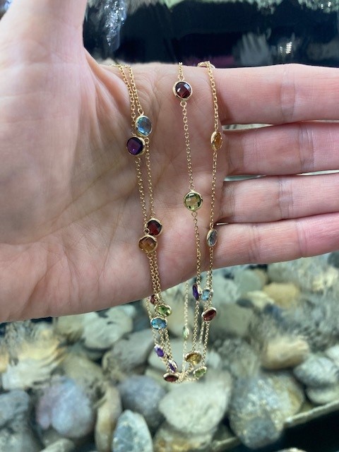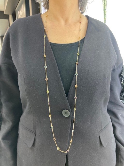 At 44 inches long, this versatile necklace can be worn as a dramatic single strand or doubled for a layered look. The rich gold setting paired with the vibrant gemstones makes it a striking statement piece—perfect for adding color and sophistication to both everyday outfits and special occasions.