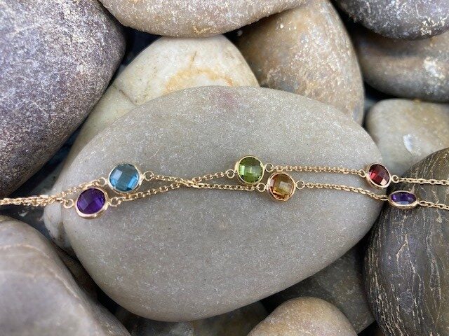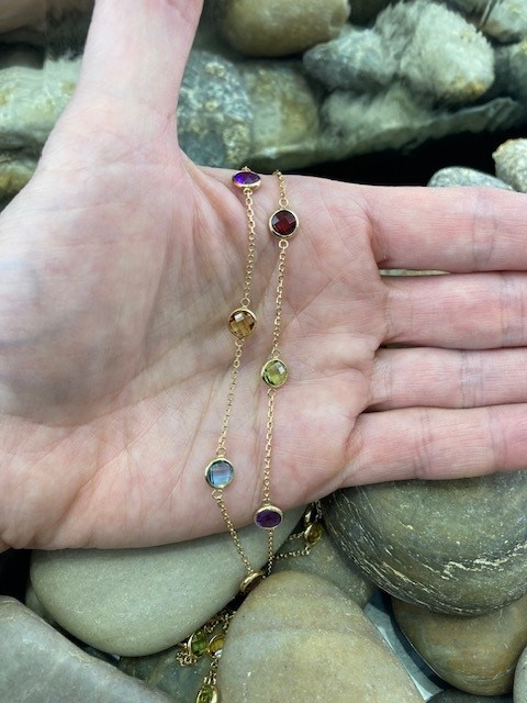 The necklace showcases a lively palette of alternating gemstones, including garnet, amethyst, citrine, peridot, and blue topaz. Each stone reflects light brilliantly thanks to the checkerboard cut, creating a colourful rhythm that runs the full length of the piece.