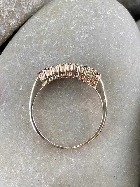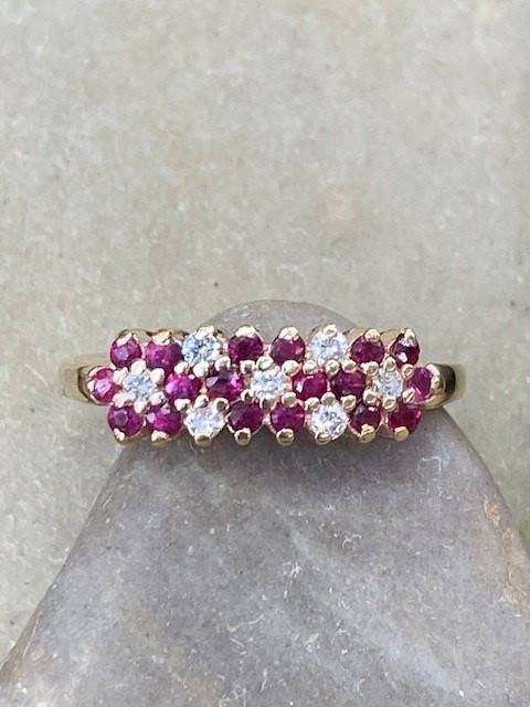 Romantic and rich with vintage charm, this beautifully crafted ring is fashioned in warm 14 karat yellow gold and designed to capture timeless elegance. Featuring 18 vibrant rubies, each measuring approximately 1.6mm in diameter.