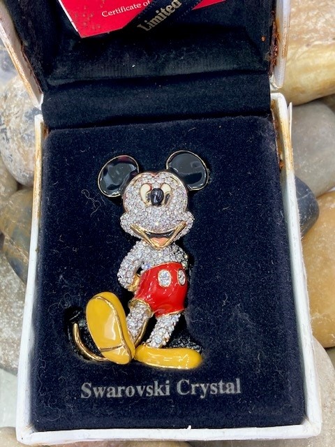 Mickey is topped with 180 bright Swarovski crystal and is finished with coloured enamel and a 23 carat gilded edge all around.