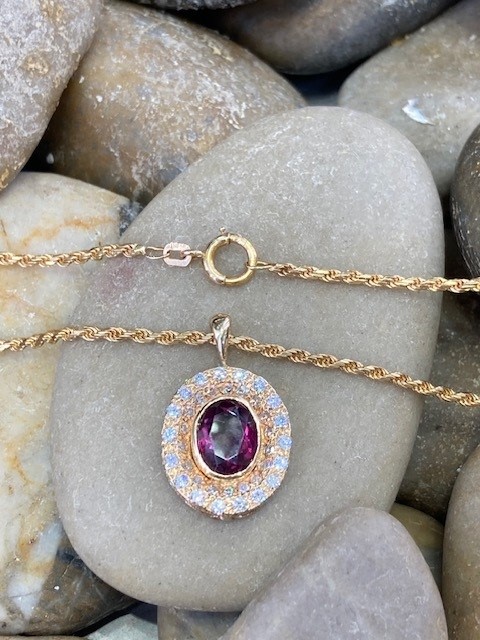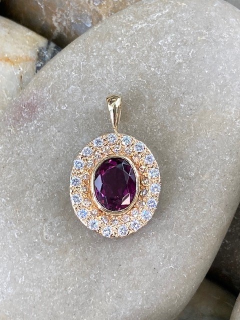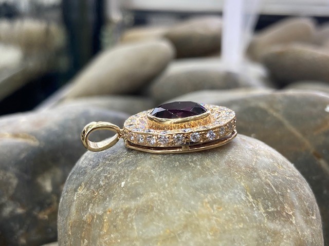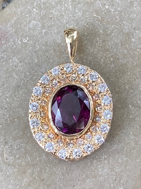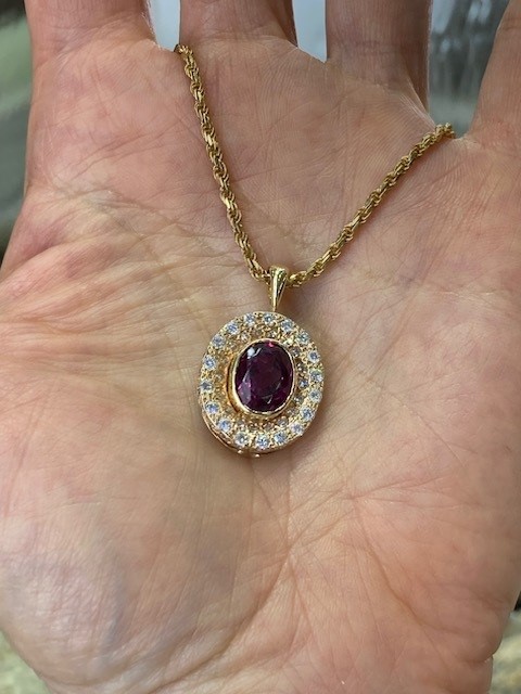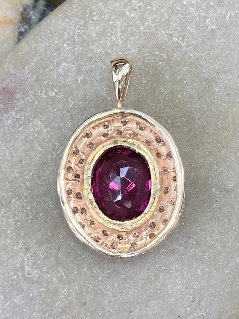 This exceptional pendant features a stunning bezel-set Rubellite at its center—an extraordinary gemstone whose rich, purplish-red hue is far more vibrant in person than any photograph can capture. Weighing 1.90 carats and measuring 8.8 x 7.5 mm, the rubellite radiates depth and intensity, making it a true focal point.