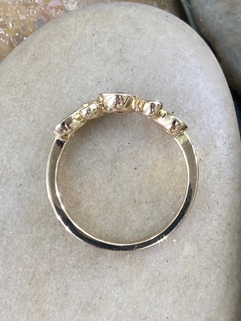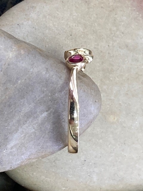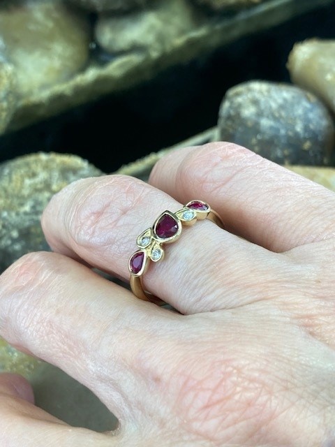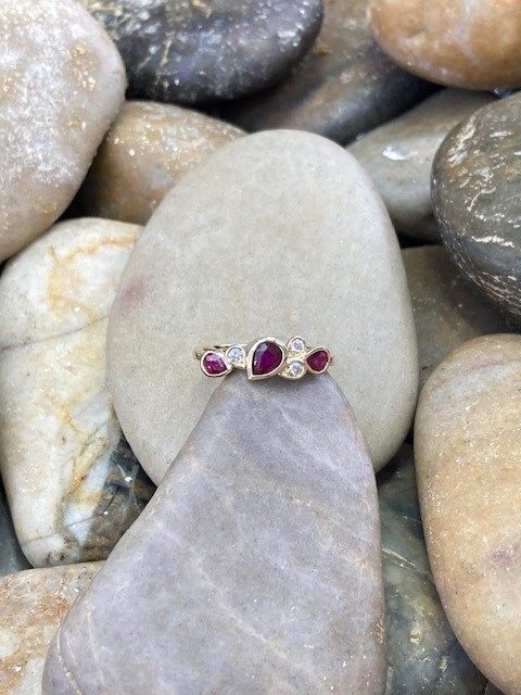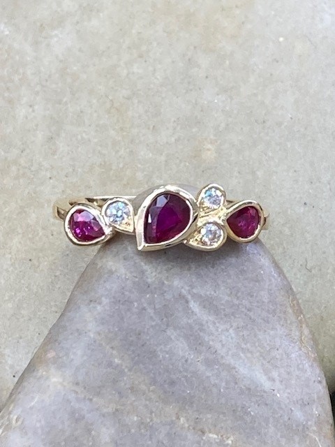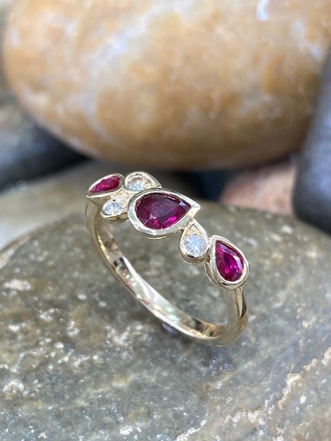 Graceful, modern, and effortlessly elegant, this striking ring showcases three pear-shaped rubies with a combined weight of 0.72 carats, each secured in smooth bezel settings. Between the rubies, three round diamonds are thoughtfully arranged and bezel set within pear-shaped frames, adding a subtle brilliance with a total weight of 0.08 carats. These diamonds feature SI1 clarity and a bright G–H colour, offering a beautiful contrast to the rich red rubies, all set in 14 karat yellow gold.