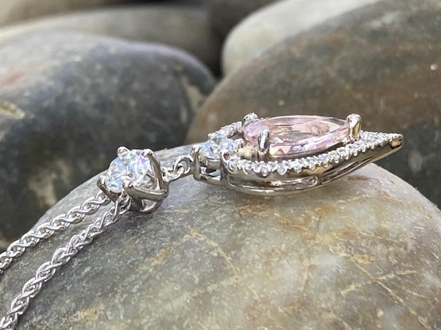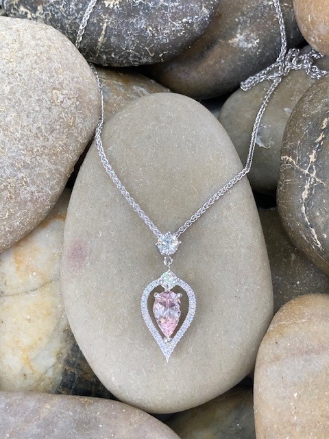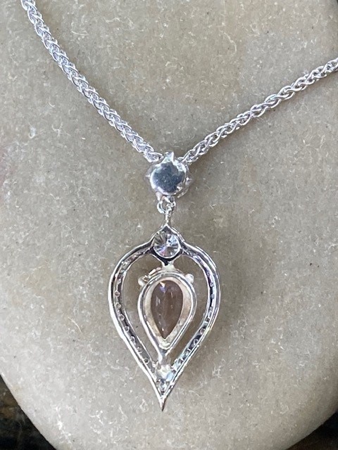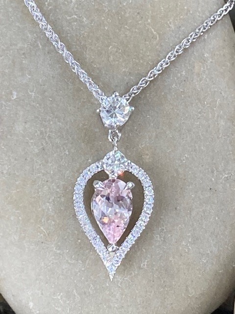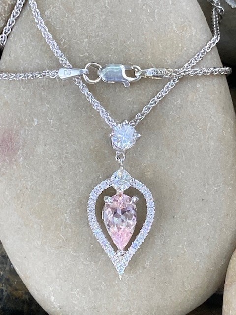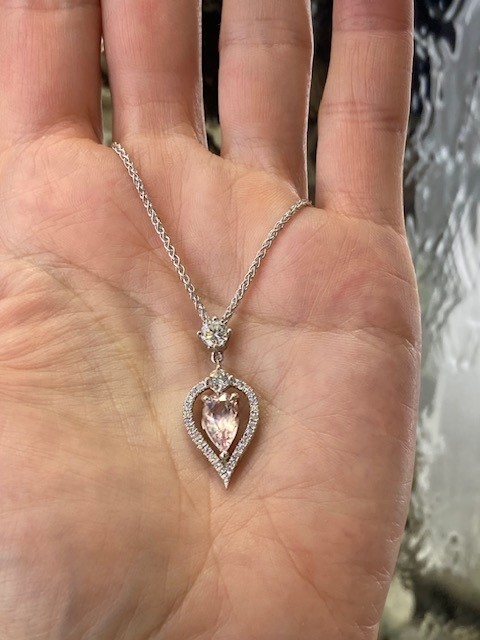 Designed to celebrate the soft blush beauty of a pear-shaped morganite, this exquisite pendant is both timeless and captivating. The center morganite measures 10.05 × 6.02 × 4.55 mm and weighs 1.35 carats, gracefully framed by 28 brilliant diamonds that trace its elegant silhouette for a total of 0.26 carats. A 0.18-carat diamond sits above the morganite, while an additional 0.44-carat diamond suspends the pendant, adding exceptional sparkle and movement.