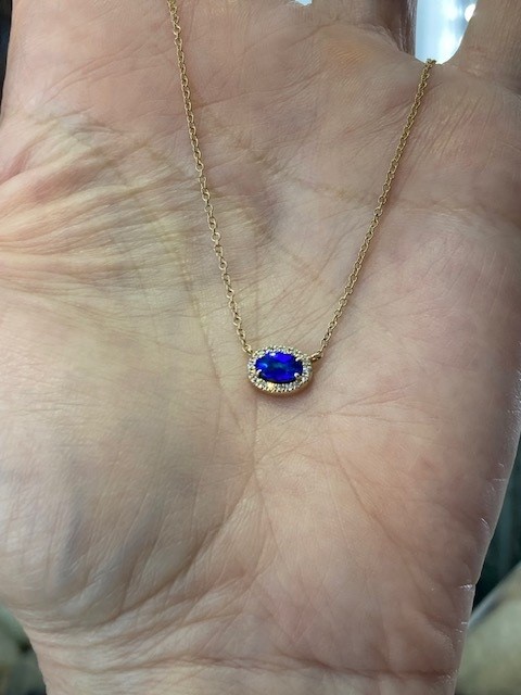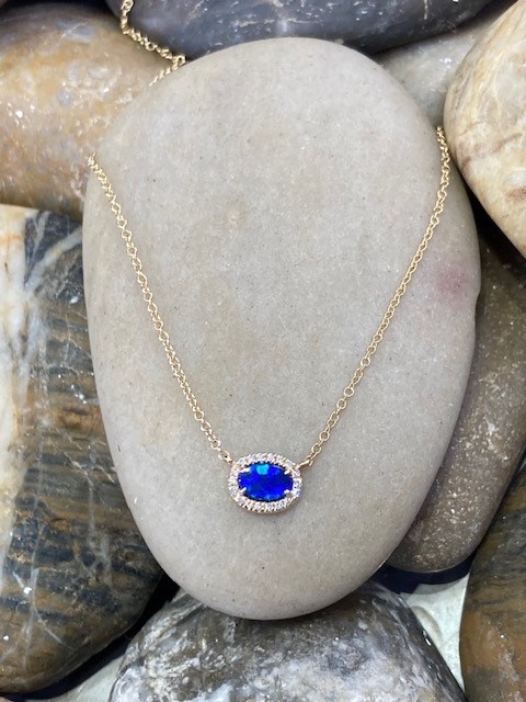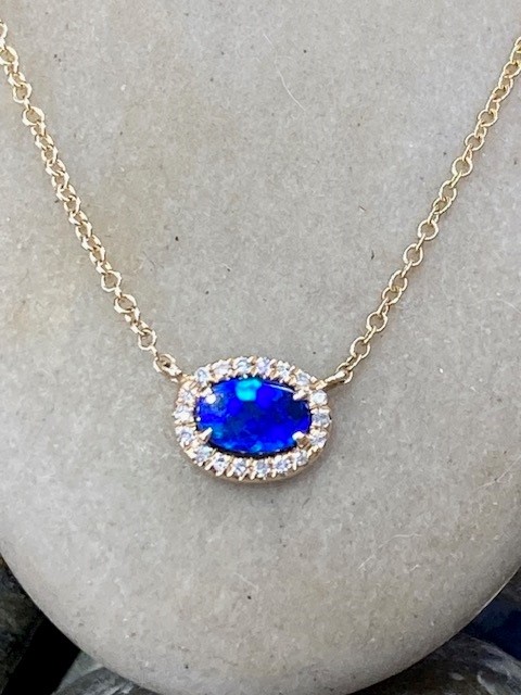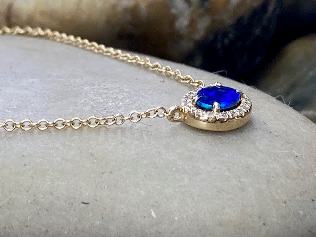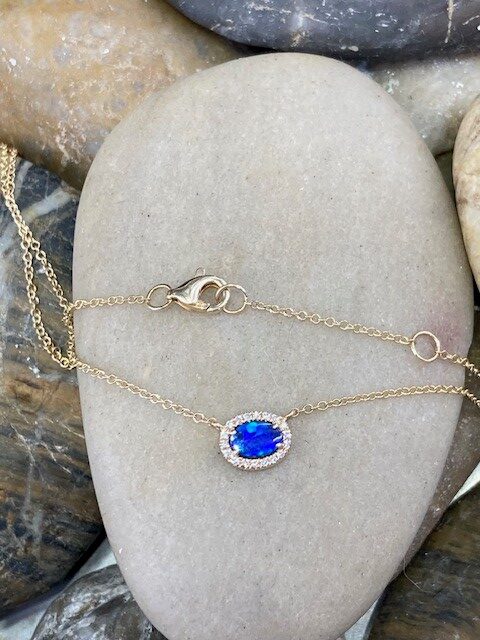 This elegant pendant features a fine 0.33-carat opal measuring 4 × 6 mm, displaying a captivating blue hue. The opal is beautifully framed by 18 sparkling mined diamonds with a total weight of 0.05 carat, carefully matched to SI1 clarity and a G–H colour range for subtle brilliance. Crafted in warm 14-karat yellow gold, the pendant is suspended from an 18″ chain featuring adjustable jump rings at 15″, 16″, and 17″, allowing for versatile styling with a variety of necklines.