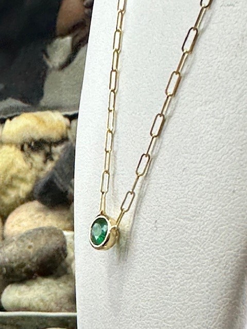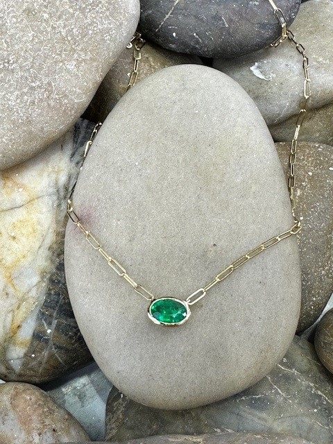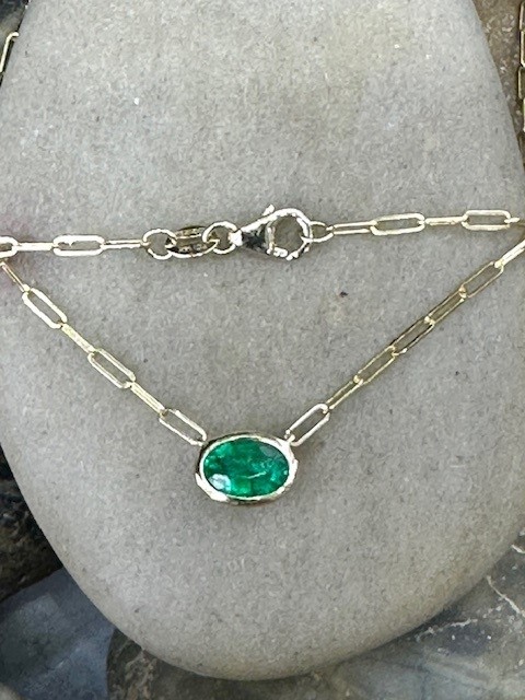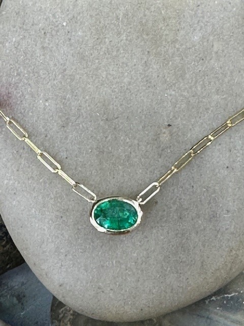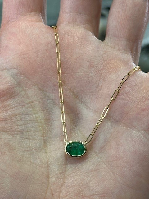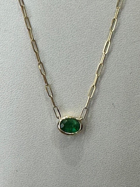 This modern necklace features a vibrant grass-green emerald, beautifully bezel set to highlight its rich colour and natural elegance. The 0.70 carat oval emerald measures approximately 6 x 8mm, offering a striking yet refined presence.