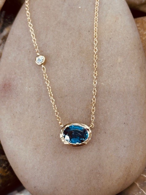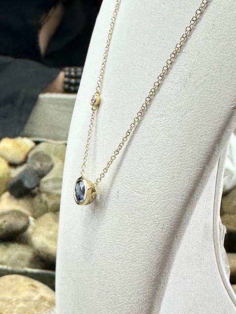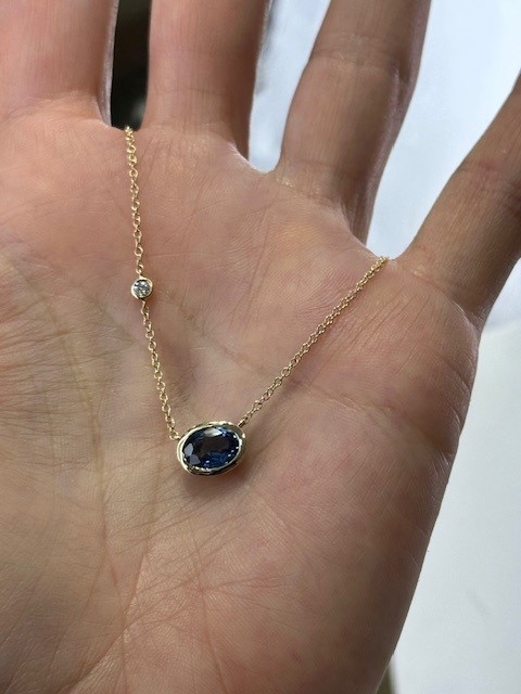 This elegant modern-style necklace showcases a stunning 1.23 carat oval sapphire, securely set in a sleek bezel that measures approximately 7.1 x 9.25mm. Suspended from an 18-inch 14 karat yellow gold chain, the design offers a refined and contemporary look.