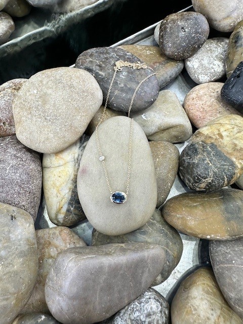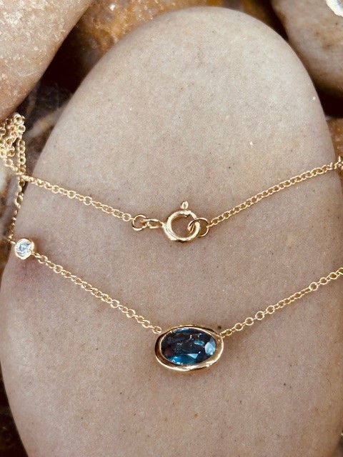 Adding a subtle touch of brilliance, a petite bezel-set diamond is positioned 20mm up the right side of the chain. This accent diamond weighs 0.04 carat and features SI1 clarity with a G colour grade, providing a delicate sparkle that beautifully complements the rich hue of the sapphire.