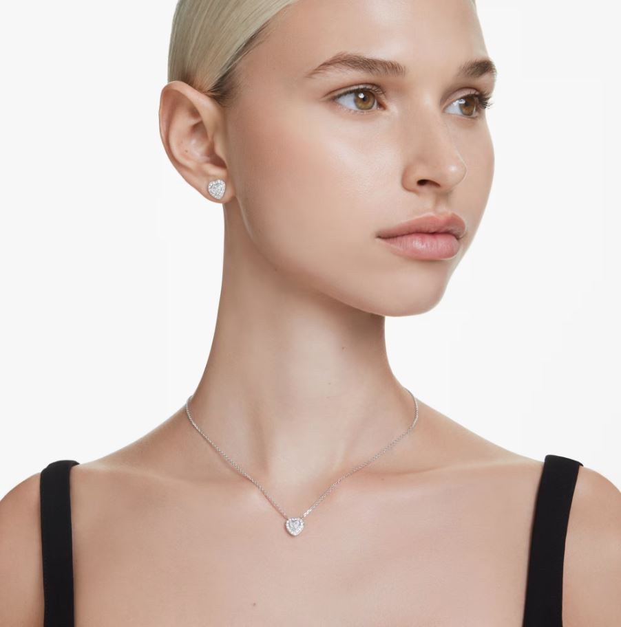 Follow your heart and let romance shine with this radiant Swarovski pendant. Suspended from a delicate chain, the rhodium plated design features a heart-shaped crystal, which is surrounded by a glittering halo of clear pavé. Pair it with the matching studs for a radiant gift of love.