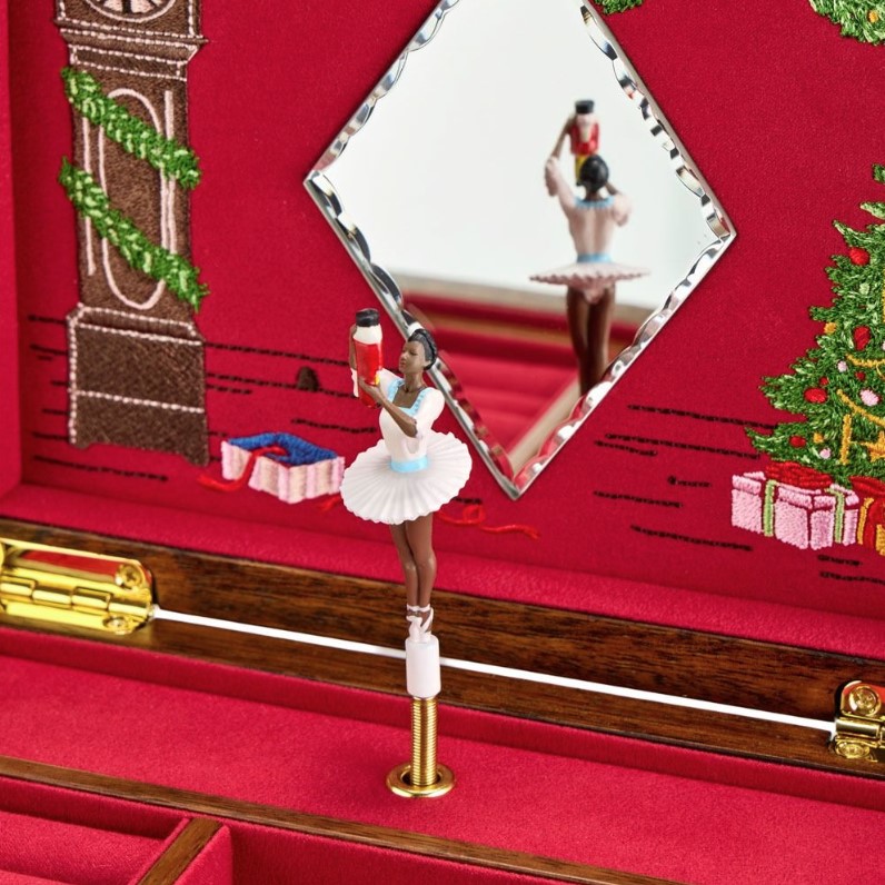 The Nutcracker box features an exclusive embroidered festive scene by British textile artist Fiona Howard, echoing the fairytale charm of the beloved ballet. Thoughtfully crafted, it includes a diamond-shaped, scalloped-edge mirror, hand-painted interchangeable dancers in two skin tones and plays Tchaikovsky’s Dance of the Sugar Plum Fairy when wound with the gold ‘W’ key. Inside, you’ll find LusterLoc™-lined compartments, five ring rolls and a secret compartment – all designed to protect and organize your jewellery with elegance.