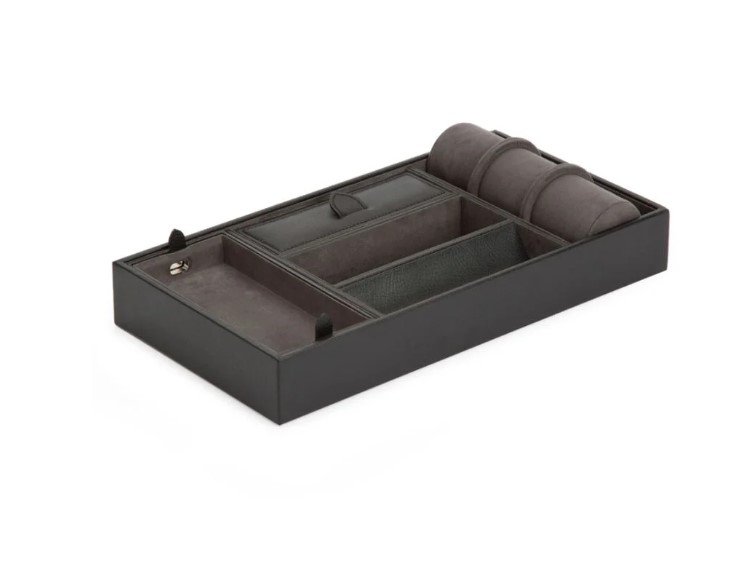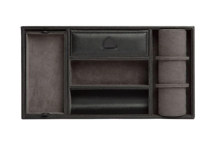 Stylish and classic, Blake is brought to life with top grain leathers, chrome and bold accents. This sleek black leather valet tray effortlessly organizes your electronics, money, jewelry, keys, watches and more. Includes grey ultrasuede lining, 5 storage compartments, and a watch cuff that is interchangeable with the Blake Watch Roll, making it easier to travel with your timepieces.
