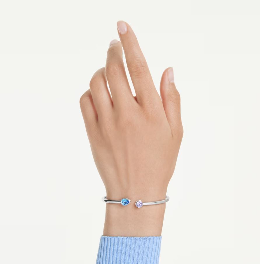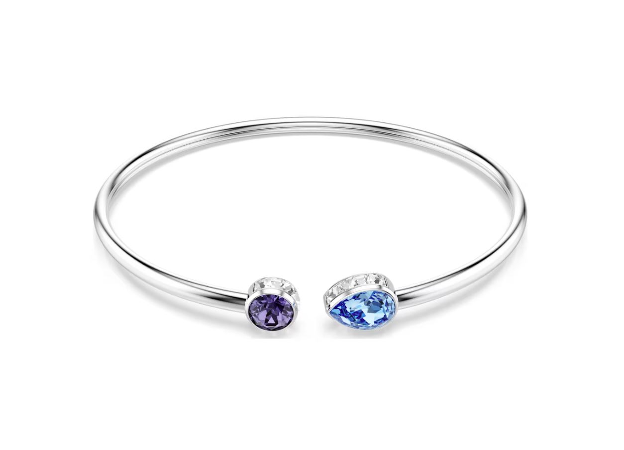 Featuring two crystals with intensive hues, this Chroma bangle is ideal for an injection of colour. The rhodium plated design is crafted for flexibility and includes blue and purple crystals at the tips, and slips easily onto the wrist for a look of all-day radiance.