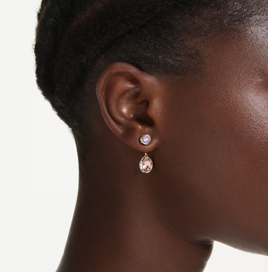 These versatile Chroma earrings give you three different ways to play with your style. Wear them as a simple pair of purple studs, or attach the hanging jackets, which are clear on one side and pink on the other. A changeable design for multiple looks.