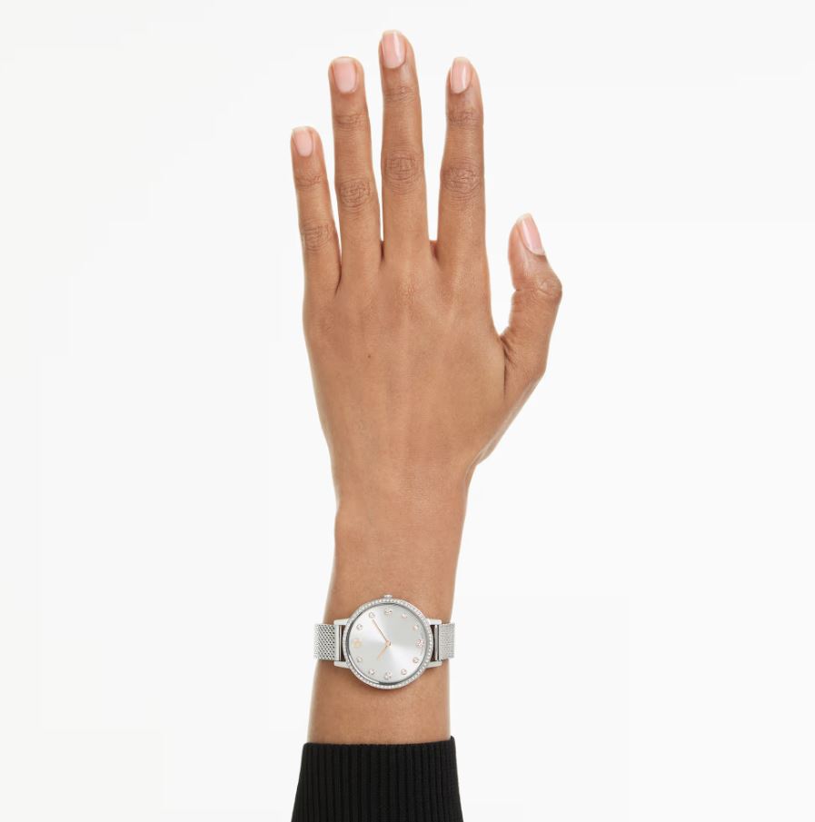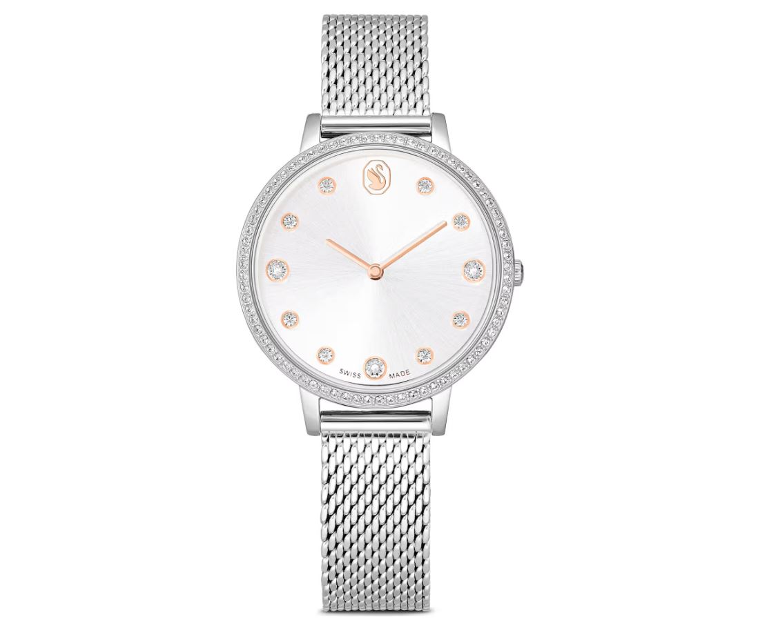 This sleek Clarica watch is distinguished by its signature Milanese bracelet, which delivers a striking mesh style around the wrist. The 35 mm design is crafted in stainless steel and features a perfectly circular bezel set with 73 clear crystals. On the sunray dial, the timepiece reveals 11 crystal indexes, a swan emblem at 12 o’clock and rose gold-tone hands. This Swiss Made watch is water-resistant to 50 m and offers a classic choice for everyday luxury.
