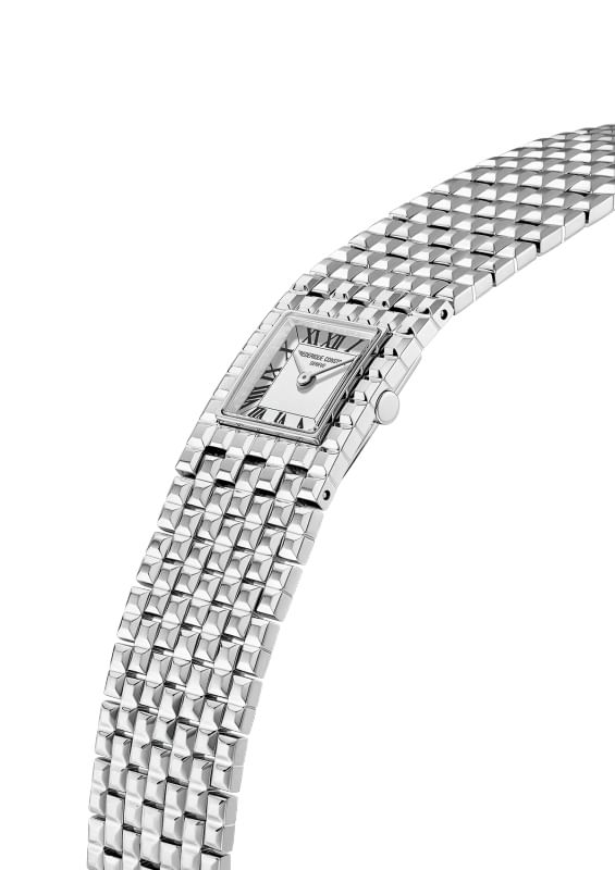 Inspired by the iconic model launched in 2002, Frederique Constant reinterprets the Classics Manchette in 2025, presenting a timepiece with an elegant and contemporary design. It’s bold character is reflected in every detail, particularly in its seven-link stainless steel bracelet, featuring a Clou de Paris shape. This version features a bold white matte finish square- shaped dial with printed Roman numerals, and silver tone hours and minutes. Powered by the FC-200 quartz movement, the Classics Manchette appeals to the woman seeking a watch with a unique presence, capable of enhancing any wrist with character, style, and distinction.