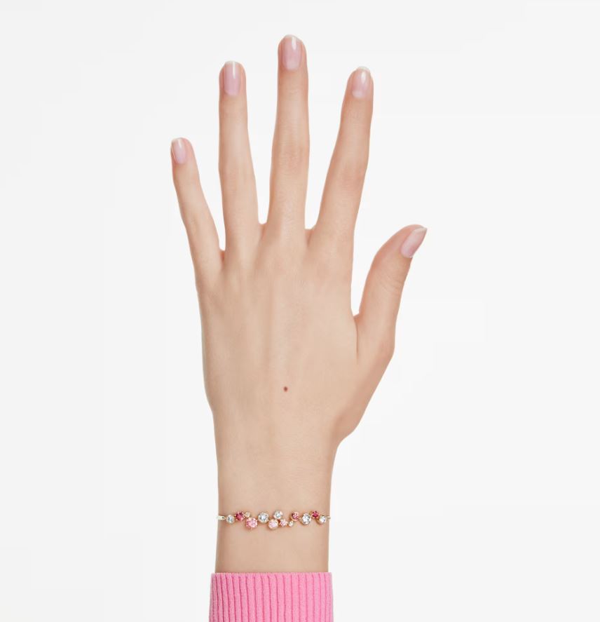 Let your playful side shine with this warm and joyful bracelet. The Constella design features a delicate chain and gold-tone plated bars, along with a vibrant display of crystals and Swarovski Zirconia in various sizes. The vivid mix of clear tones and pink and red shades gives the bracelet a captivating appearance, while the sliding adjustment allows you to easily change the fit.