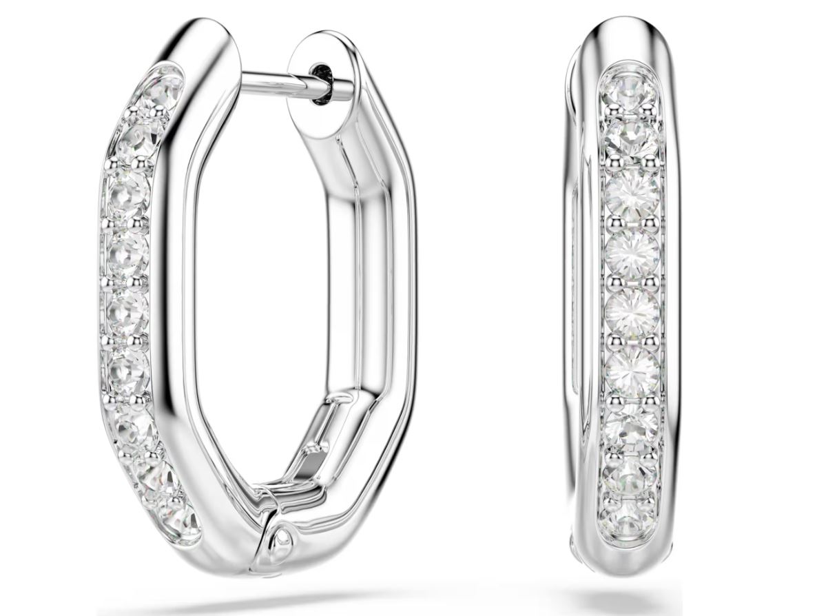 Make an expressive statement with these geometric hoop earrings. Their slender octagonal design creates a bold frame for the single row of clear round-cut crystals, which are each placed in a delicate prong setting. A special spring plate mechanism makes these earrings easy to open and close, while the rhodium plating is ready to mix and match with other Dextera pieces.