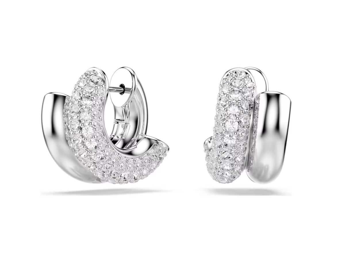 Embodying the industrial style of Dextera, these tubular earrings combine a gleaming rhodium plated surface with a pavé of clear crystals on one side. An additional spring plate mechanism ensures each piece is easy to take on and off. Wear these mini hoops as a distinctive choice for your day to night styling.
