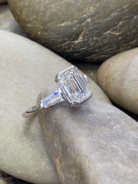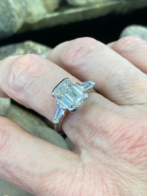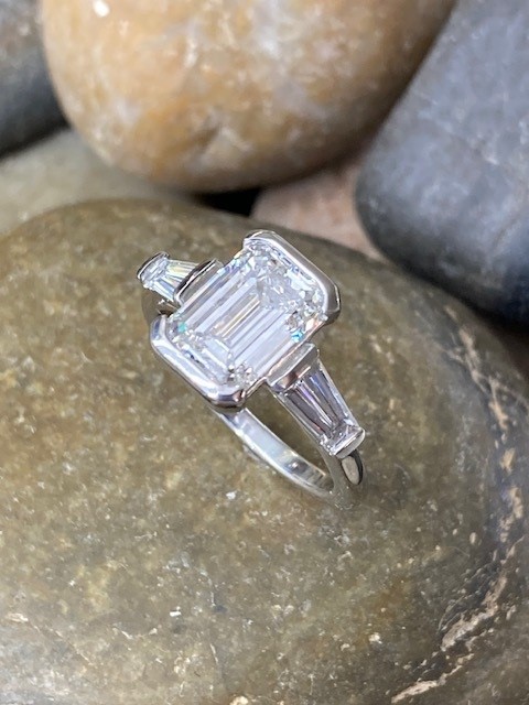 Expertly set in luxurious platinum, the center stone is framed by perfectly two matched tapered baguette side diamonds, also lab grown, in VVS clarity and E–F colour, totaling 0.69 carat. Their clean lines and bright white brilliance enhance the architectural beauty of the emerald cut while adding a timeless Art Deco influence.