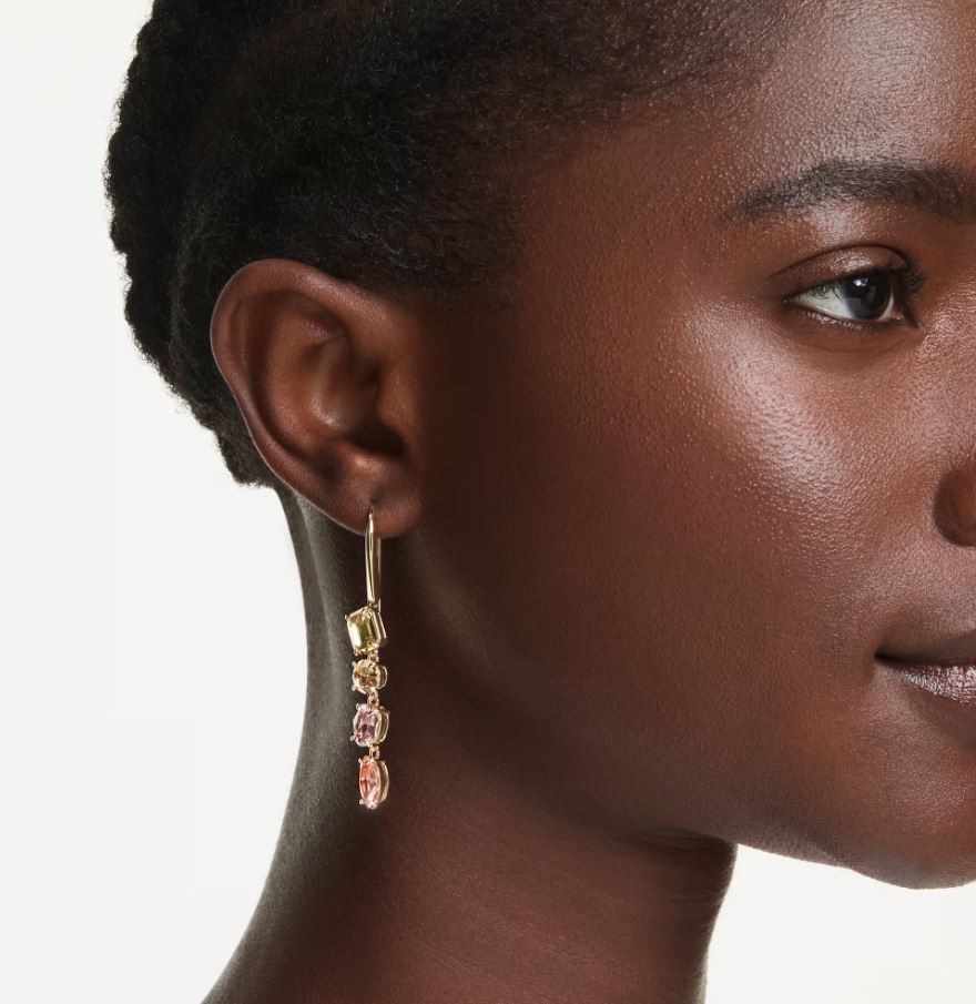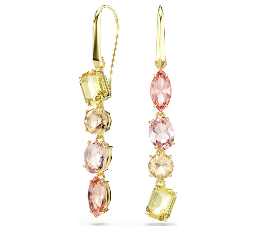 Unexpected formations are the signature style of the Gema family. In these cascading earrings, that spirit is beautifully brought to life through two colourful strands of different-shaped crystals. The asymmetrical pair reveals varying shades of yellows and pinks, all placed within a gold-tone plated setting for a look that is warm and glowing.