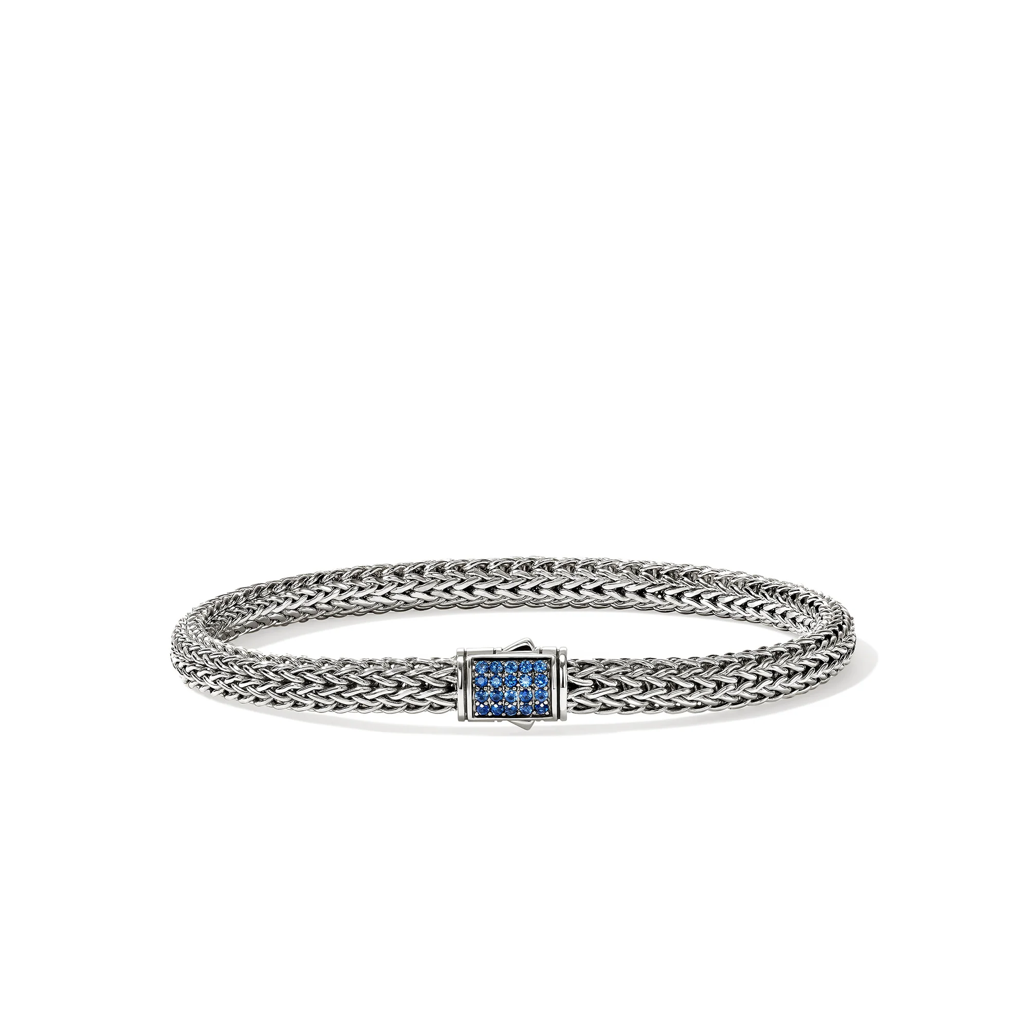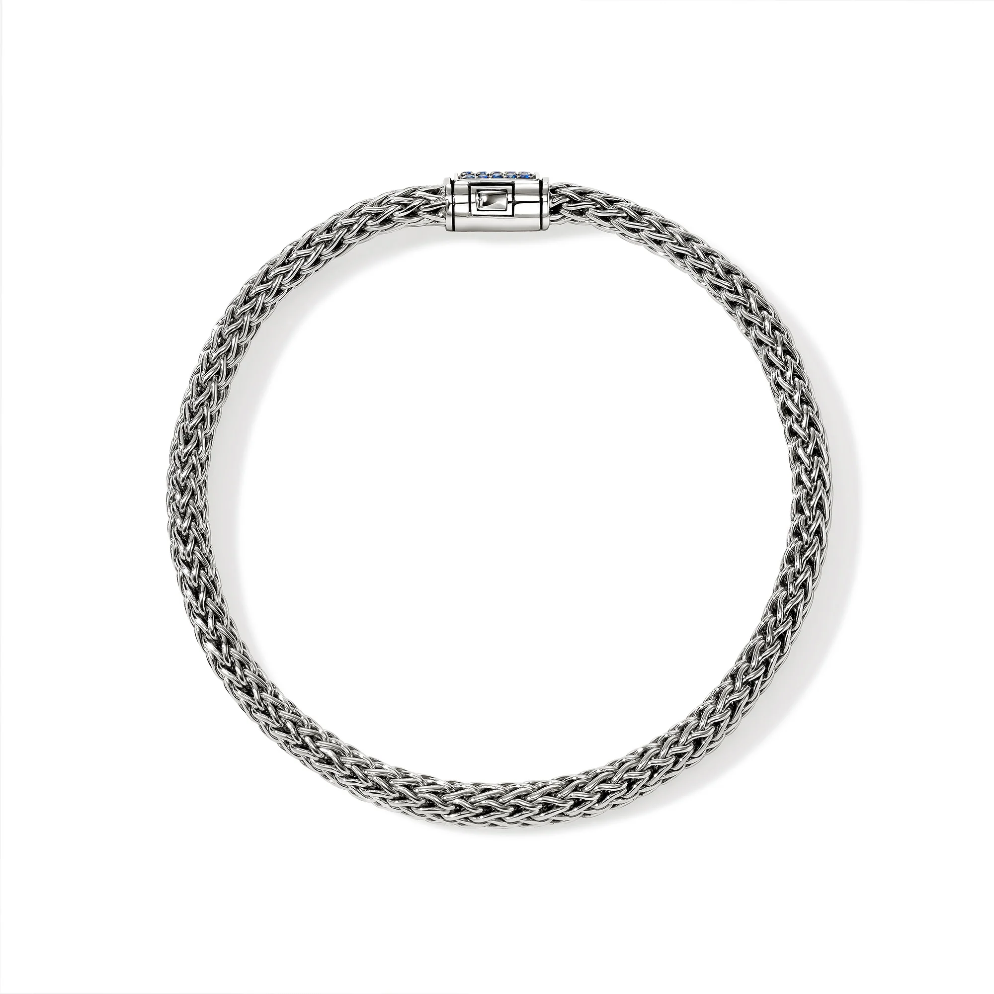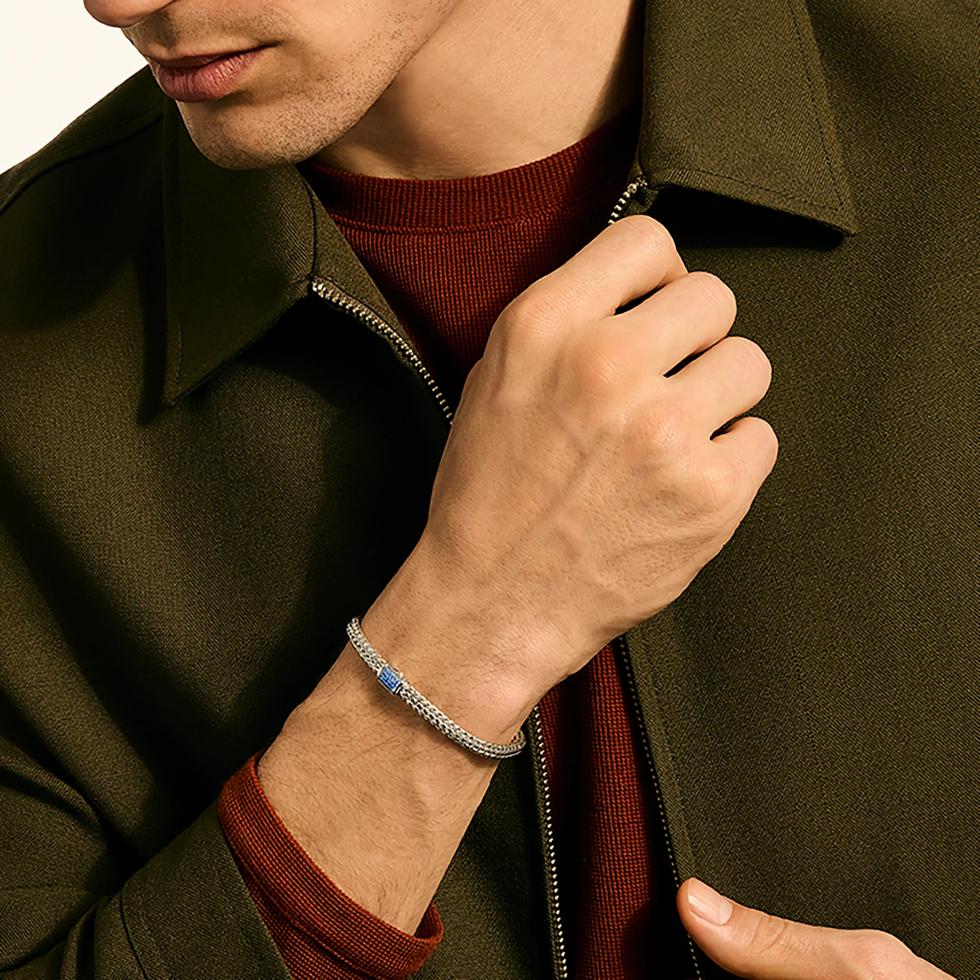 Woven in reclaimed sterling silver, the Icon Chain bracelet is a foundational expression of our craft. This edition features a blue sapphire clasp—ethically sourced and set by hand in a micro-pavé, for maximum brilliance.
