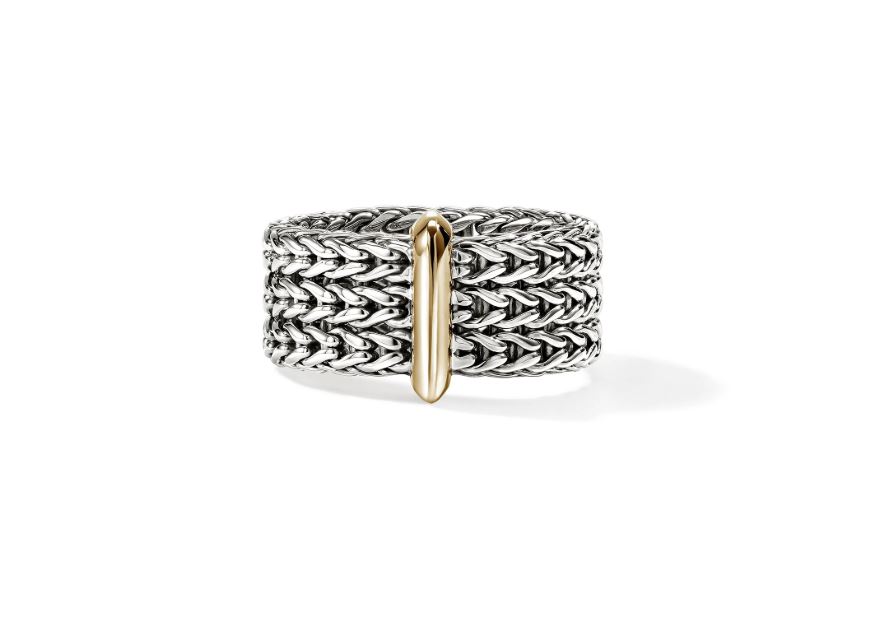 A seamless flat-weave ring with a low profile and minimalist link accent. Artisan handcrafted in reclaimed sterling silver and gold.