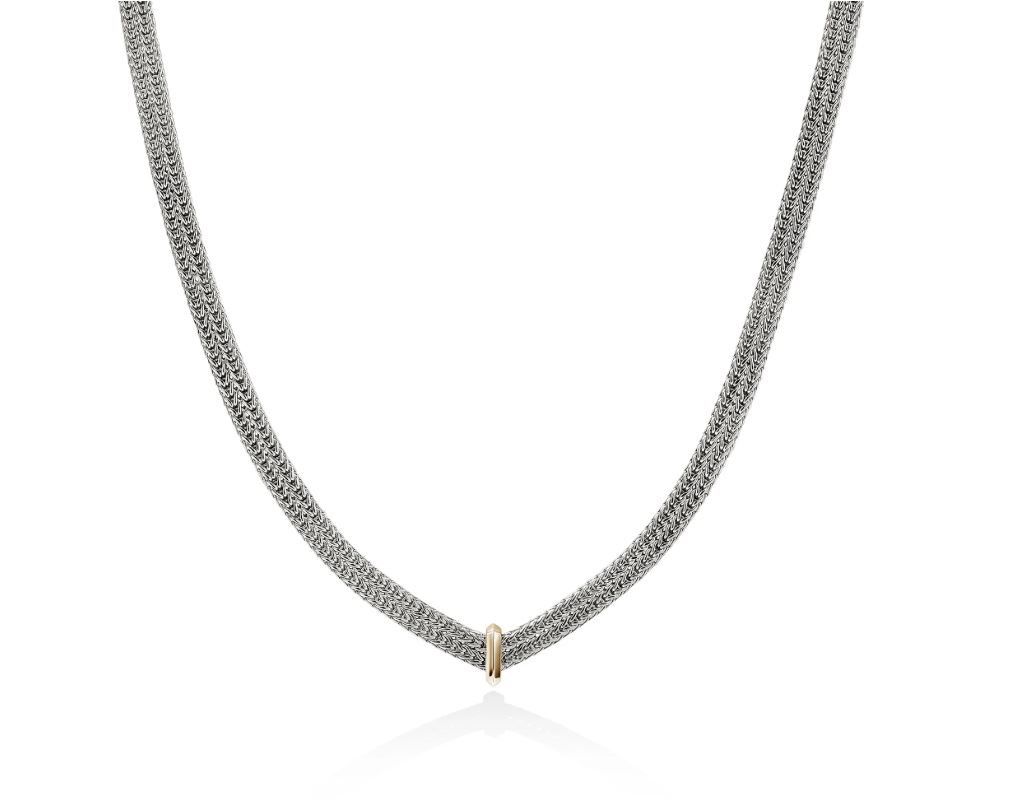 This low-profile necklace features a technically masterful weave reminiscent of knit textile. Artisan handcrafted in reclaimed sterling silver and gold.