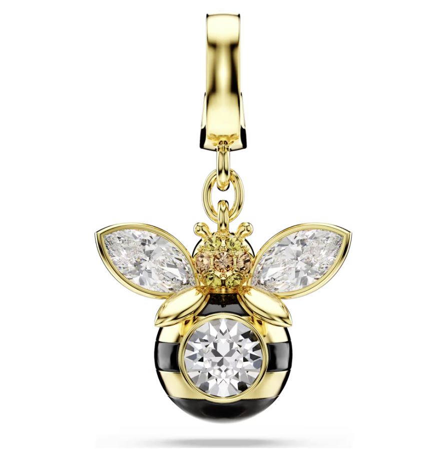 Adding a personal touch to your daily style, this busy bee charm is an ideal choice for those who love nature. Decorated in black and yellow stripes and with wings made of clear crystals, the gold-tone plated creation features a custom-designed clasp, allowing you to wear the charm on various necklaces and bracelets.