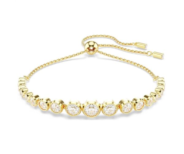 Made for everyday elegance, this gold-tone plated bracelet exudes the simplicity of the Imber family. The design features a gradient of clear round-cut crystals, each placed in a modern bezel setting on a soft chain, with a sliding closure for easy wearability. Each delicate drop provides glowing sophistication for your wrist, giving you a go-to piece of jewellery that can be playfully stacked with other styles.