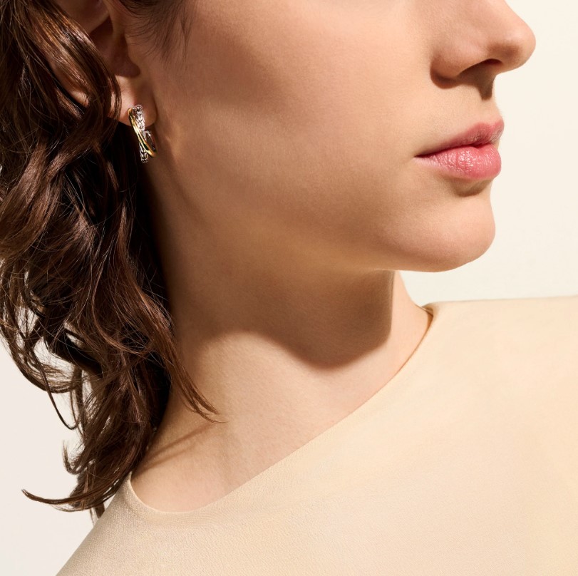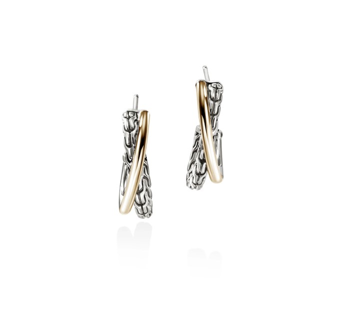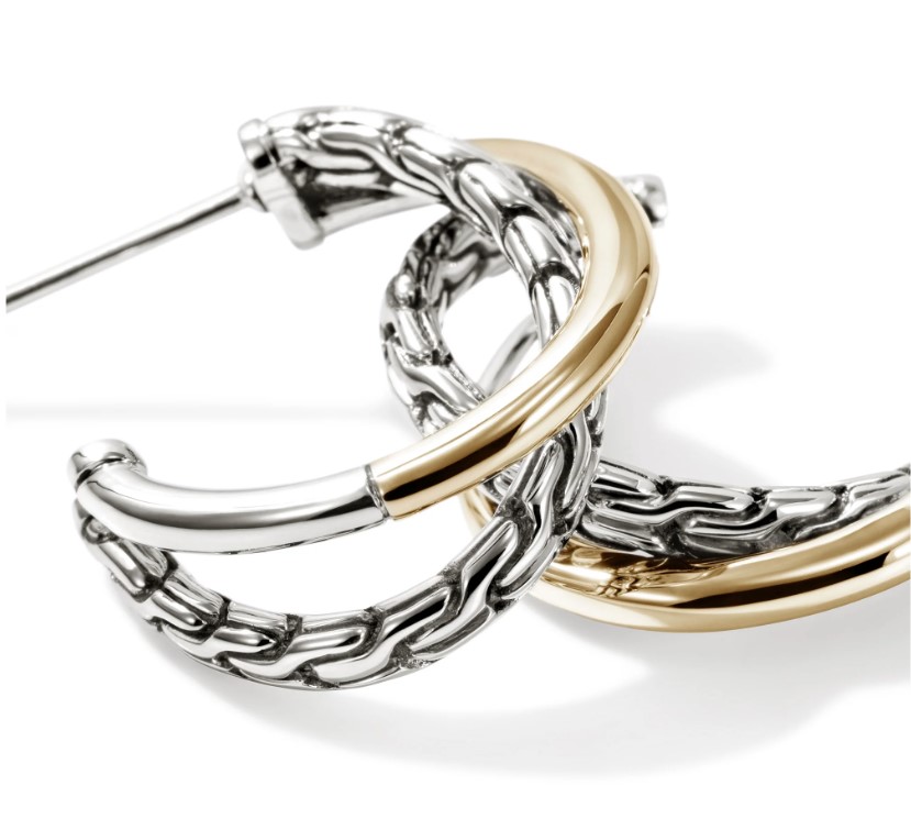 A set of crossover hoop earrings in reclaimed gold and sterling silver, featuring our signature carved chain texture offset by high-shine gold. Artisan handcrafted.