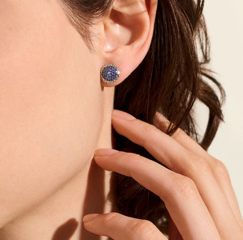 These pavé stud earrings feature our signature carved chain motif in reclaimed sterling silver and ethically sourced blue sapphires. Artisan handcrafted.