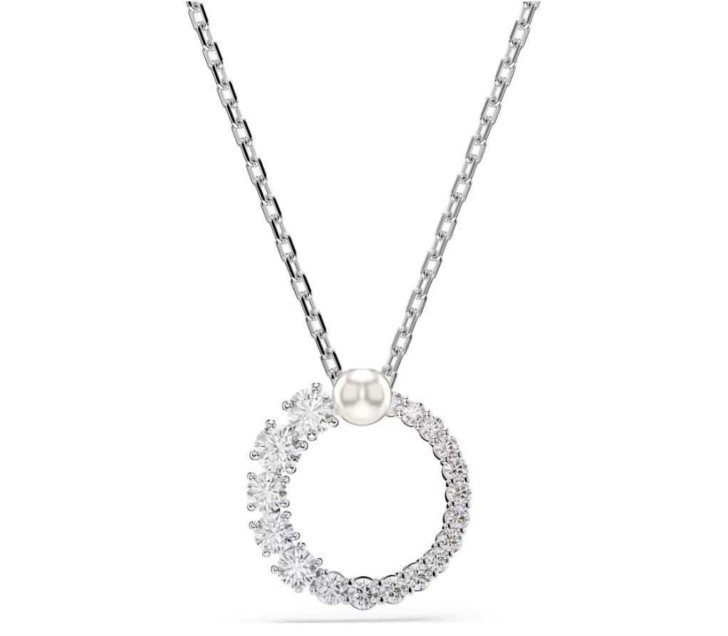 With its classic silhouette and contemporary detailing, this elegant Matrix pendant will attract attention. Suspended from a delicate chain, the rhodium plated piece features a ring of clear Swarovski Zirconia in different sizes, ranging from small to large, bookmarked with a white Swarovski Crystal Pearl at the centre. Style solo or stack with matching earrings to dial up the drama.