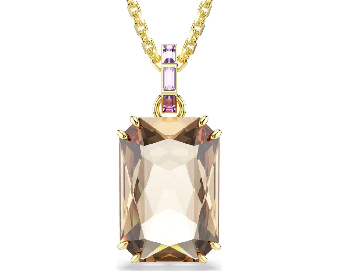 This glowing Millenia pendant is a creation of pure warmth and luxury. The central motif is crafted from a large caramel crystal in a double prong setting and connects to the 18k gold finish chain via an elegant bail adorned with channel-set purple crystals. Combine this pendant with a matching pair of earrings or a bangle to express an ultra-modern look.
