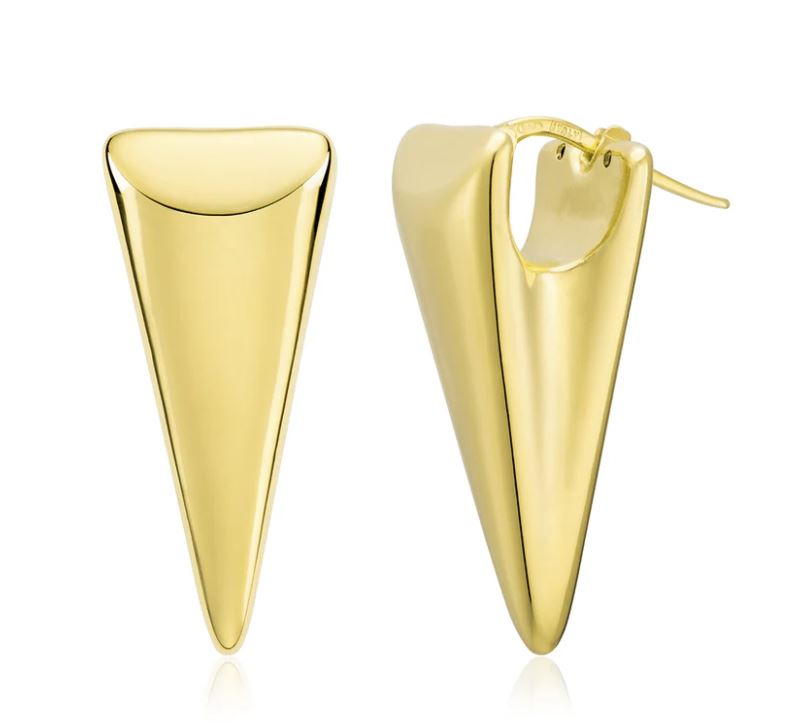 Reach new heights of style with our Peak Hoop Earrings. These long, pointy hoops extend to a peak, creating a unique and captivating look. With a slightly puffy shape and a high-polish finish, they add a touch of modern flair to any ensemble.