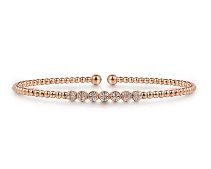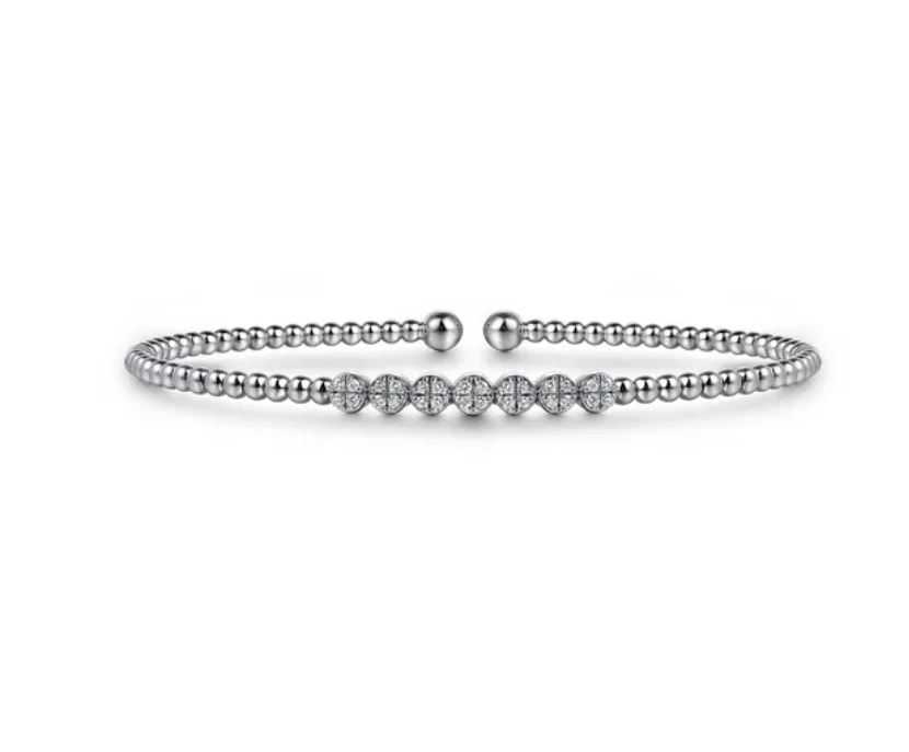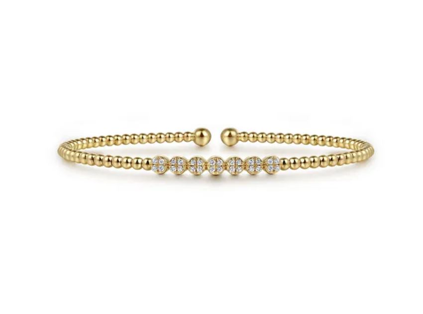 A refined blend of texture and sparkle. This 14K yellow gold bangle from Gabriel & Co.’s iconic Bujukan collection features the signature beaded design, accented by brilliant diamond clusters that add a radiant touch of glamour to this modern classic.