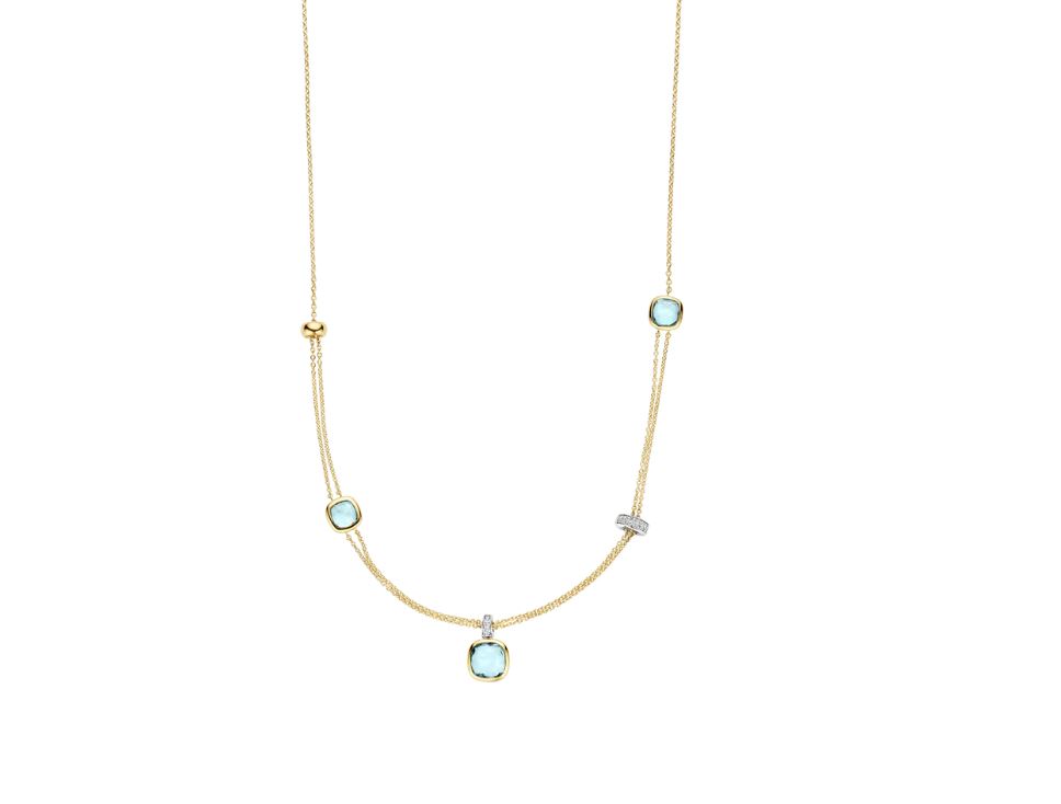 The combination of the fresh blue hue, warm gold finish and sparkling zirconia creates a vibrant play of light. The fine double chain and layered design make this cushion necklace easy to style with other gold-plated or silver necklaces, while also allowing it to stand beautifully on its own as a refined focal point. 34122TY/50 Cushion & Rectangular necklace