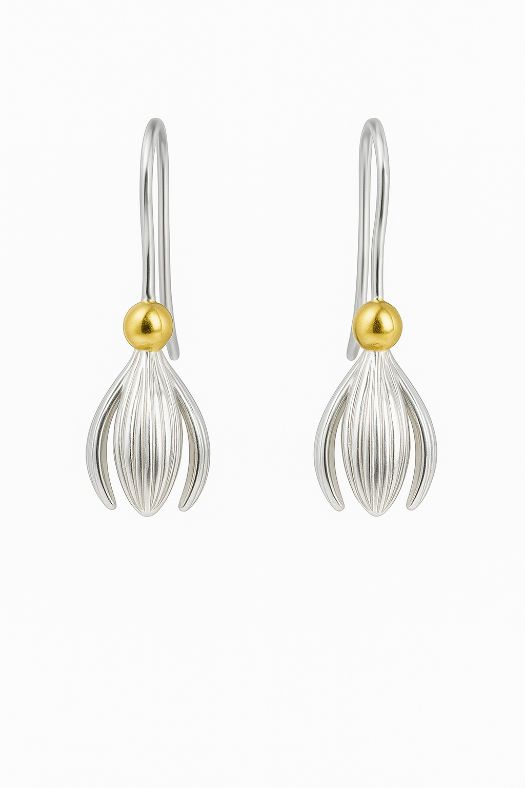 Crafted in sterling silver with warm 18kt yellow gold accents, each earring reflects the snowdrop’s gentle silhouette—symbolizing hope, renewal, and inner resilience. The finely detailed petals and elegant drop design bring a timeless charm that transitions beautifully from everyday wear to special occasions.